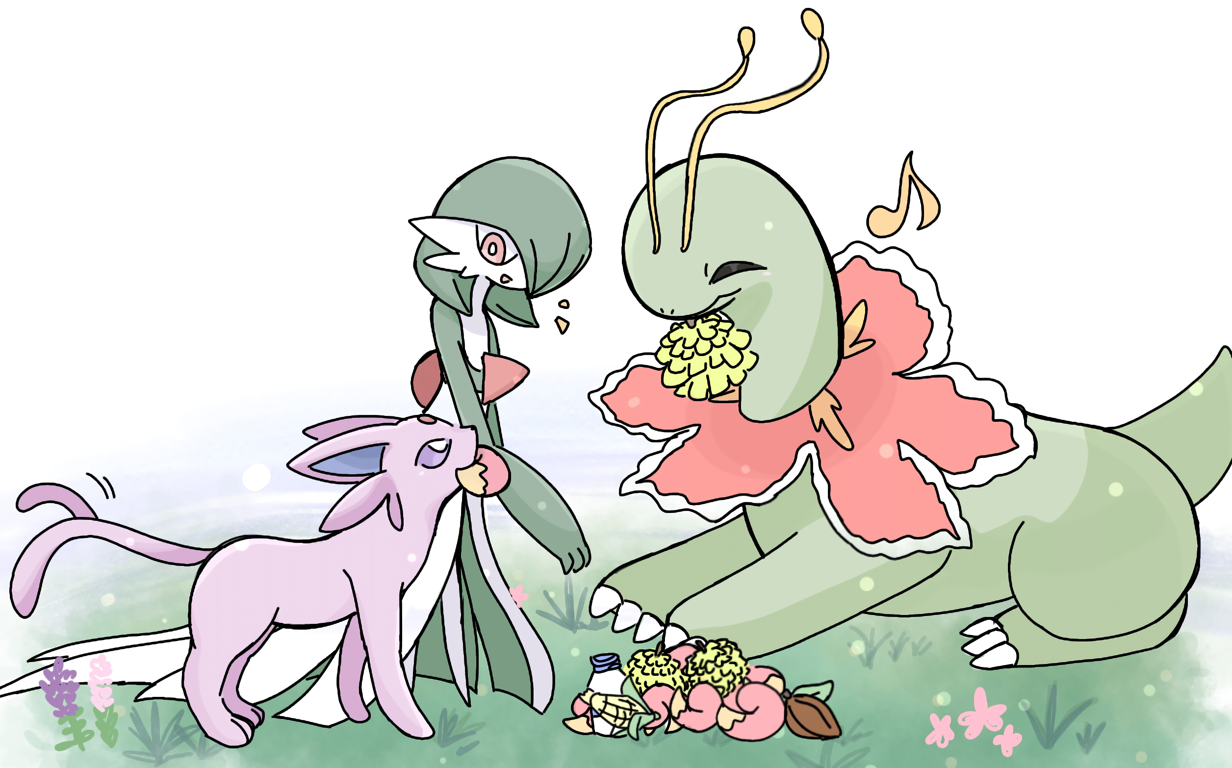^_^ berry_(pokemon) bob_cut bottle bright_pupils claws closed_eyes colored_skin durin_berry espeon eye_contact flat_chest flower forked_tail full_body gardevoir gen_2_pokemon gen_3_pokemon grass green_hair green_skin hair_over_one_eye happy looking_at_another looking_down looking_up mago_berry meganium milk_bottle moomoo_milk mouth_hold multicolored_skin musical_note nintendo no_feet notice_lines one_eye_covered open_mouth outdoors pink_flower pokemon pokemon_(creature) purple_flower red_eyes short_hair sitting smile standing suzu_(pixiv_32232702) tail two-tone_skin white_background white_pupils white_skin
