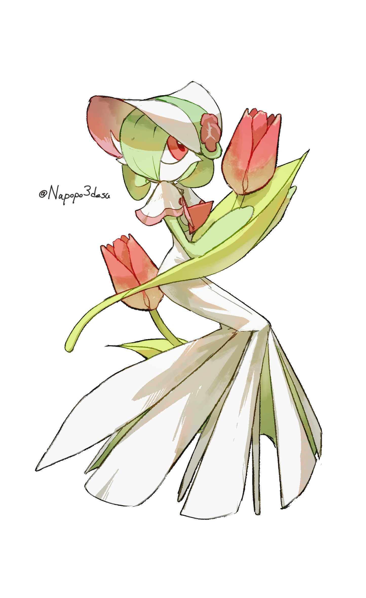 1girl artist_name bob_cut bonnet capelet clothed_pokemon colored_skin female_focus flat_chest flower gardevoir gardevoir_(fashionable) gen_3_pokemon green_hair green_skin hair_over_one_eye hands_up hat hat_flower holding holding_flower invisible_chair knees_together_feet_apart looking_to_the_side multicolored_skin napopo nintendo no_feet no_mouth one_eye_covered oversized_object pink_trim pokemon pokemon_(creature) pokemon_unite red_eyes red_flower red_tulip short_hair sideways_glance signature simple_background sitting solo tulip twitter_username two-tone_skin white_background white_bonnet white_capelet white_skin