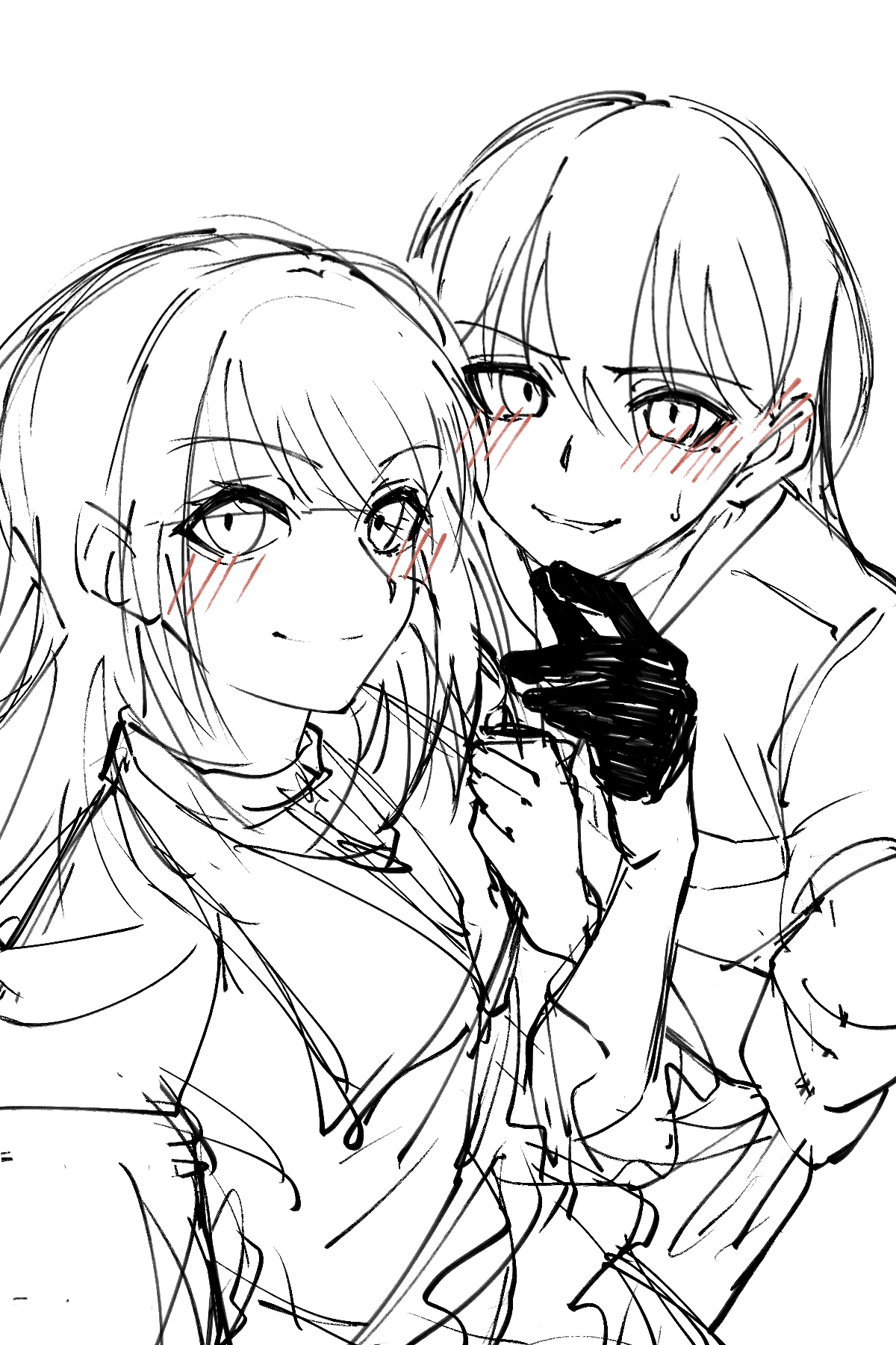2girls bang_dream! bang_dream!_it's_mygo!!!!! blush chinese_commentary commentary_request doki_(oox3o) gloves hand_on_another's_chin highres long_hair mole mole_under_eye multiple_girls open_mouth photo-referenced shiina_taki simple_background sketch sweatdrop white_background yahata_umiri