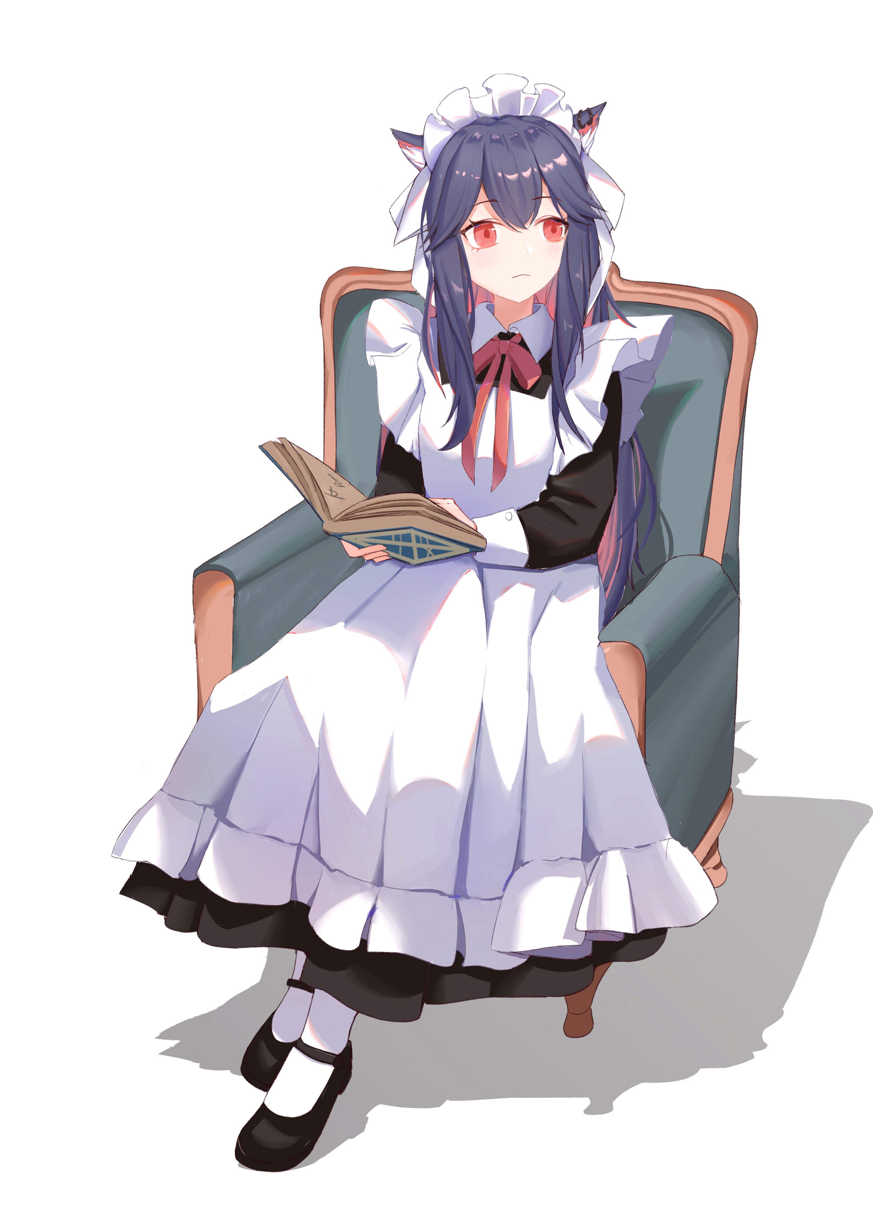 1girl absurdres alternate_costume animal_ears apron arknights axiuya black_dress black_hair black_shoes book chinese_commentary closed_mouth collared_dress colored_inner_hair commentary_request contrast_collar couch dress enmaided frills full_body highres holding holding_book long_dress long_hair long_sleeves looking_to_the_side maid maid_apron maid_headdress mary_janes multicolored_hair neck_ribbon on_couch open_book pantyhose red_eyes red_hair red_ribbon ribbon shoes sitting solo texas_(arknights) white_apron white_pantyhose wolf_ears wolf_girl