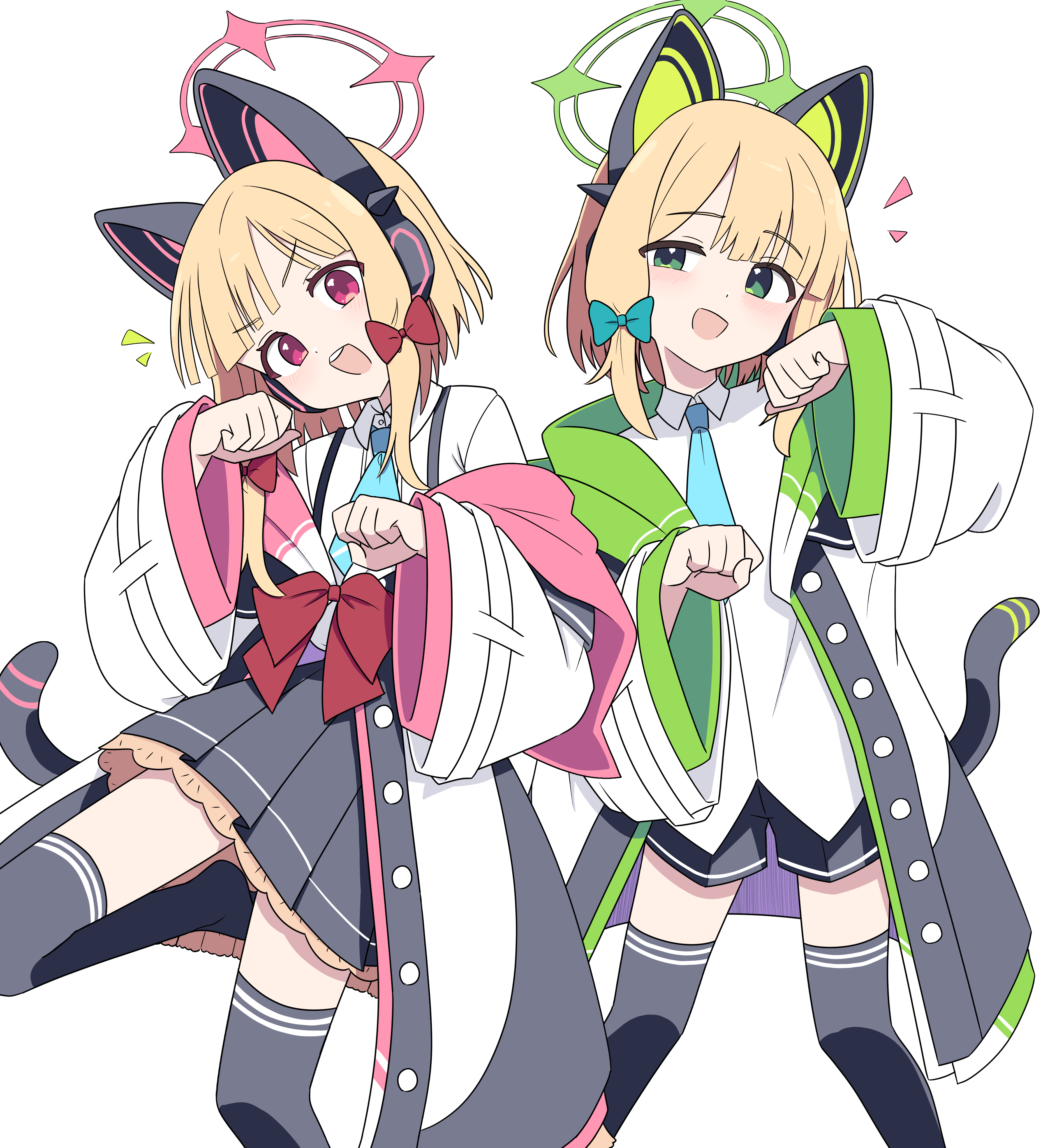 2girls absurdres animal_ear_headphones animal_ears blonde_hair blue_archive blue_necktie cat_ear_headphones cat_ears commentary_request fake_animal_ears fukunao game_development_department_(blue_archive) green_eyes green_halo halo headphones highres midori_(blue_archive) momoi_(blue_archive) multiple_girls necktie pink_halo red_eyes siblings smile twins