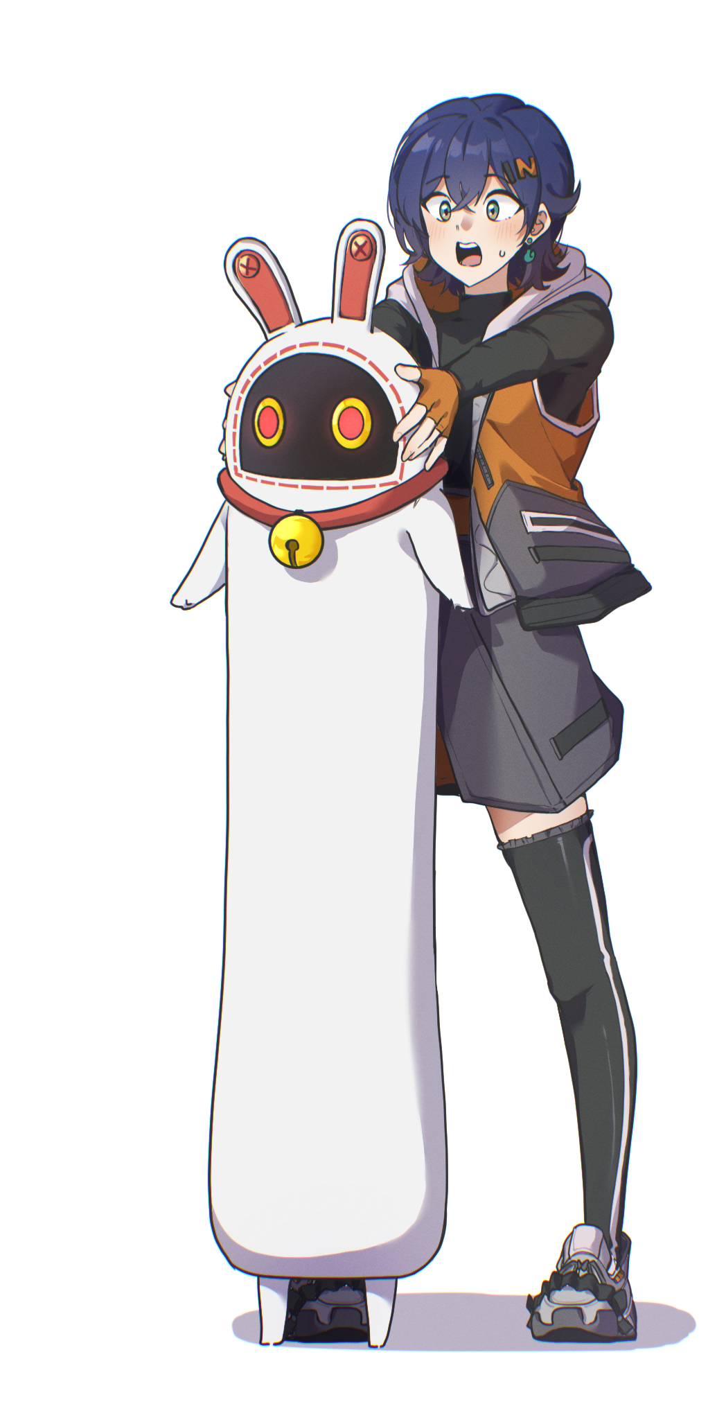 1girl bangboo_(zenless_zone_zero) belle_(zenless_zone_zero) black_shirt black_thighhighs blue_hair commentary crossed_bangs earrings english_commentary fingerless_gloves full_body gloves green_eyes hair_between_eyes hair_ornament highres jewelry letter_hair_ornament luckyboo_(zenless_zone_zero) open_mouth orange_gloves sagjecanggo shadow shirt short_hair simple_background single_fingerless_glove single_thighhigh sweatdrop thighhighs white_background zenless_zone_zero