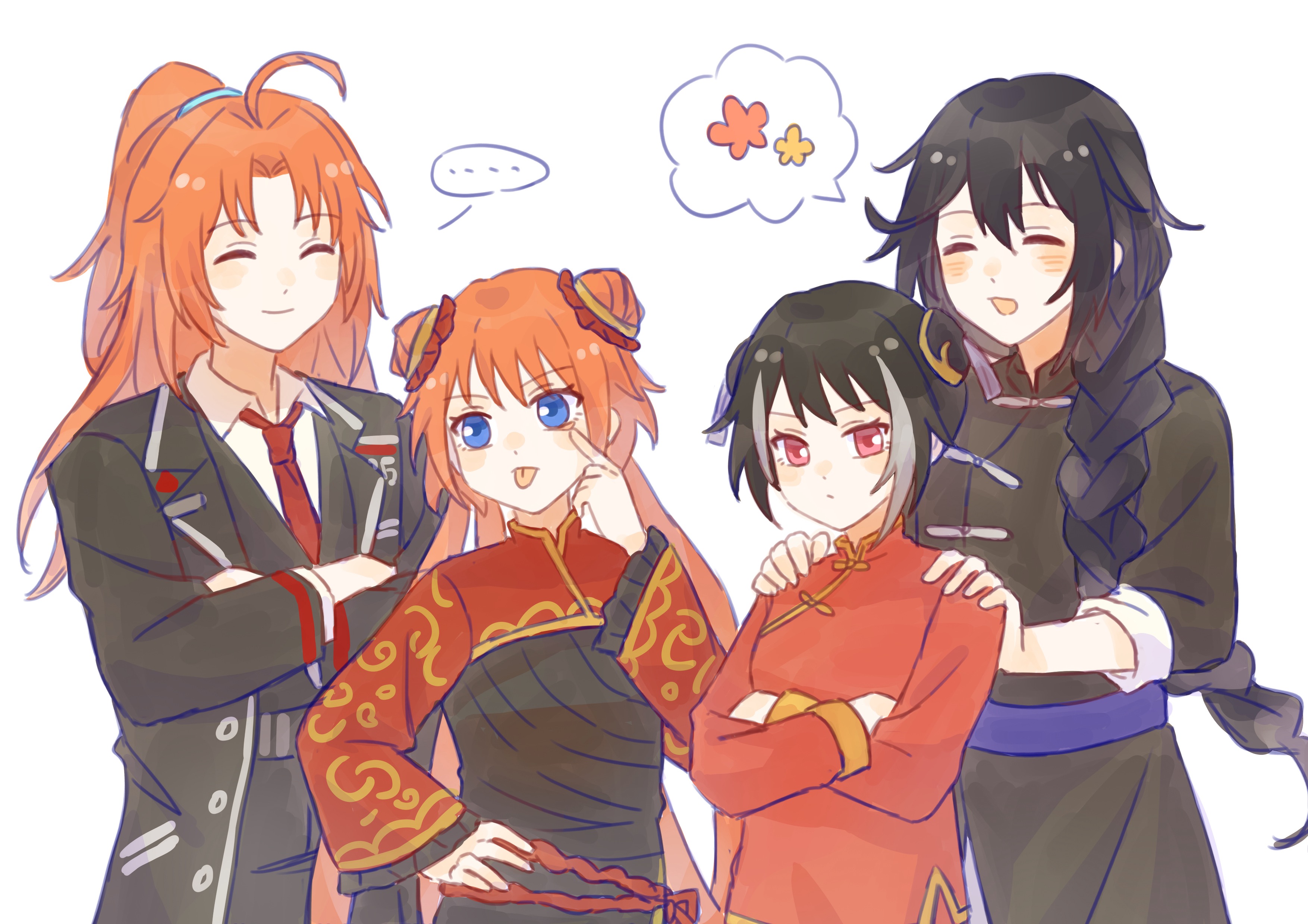 ... 2boys 2girls :d :p ^_^ absurdres ahoge akanbe alternate_hairstyle black_coat black_dress black_hair black_vest blue_eyes braid braided_ponytail brother_and_sister bun_cover buzhe477 china_dress chinese_clothes chinese_commentary closed_eyes closed_mouth coat collared_shirt commentary_request crossed_arms crossover double_bun dress eyelid_pull frilled_sleeves frills gintama grey_streaks group_hairstyle_switch hair_bun hairstyle_switch hand_on_own_hip hands_on_another's_shoulders high_ponytail highres hong_lu_(project_moon) jia_xichun_(project_moon) kagura_(gintama) kamui_(gintama) lcb_uniform_(project_moon) limbus_company long_hair long_sleeves multicolored_hair multiple_boys multiple_girls necktie open_clothes open_coat open_mouth orange_hair pankou parted_bangs ponytail project_moon red_dress red_eyes red_necktie red_shrug red_sleeves shirt short_hair shrug_(clothing) siblings simple_background smile speech_bubble spoken_ellipsis streaked_hair tangzhuang tongue tongue_out vest white_background white_shirt