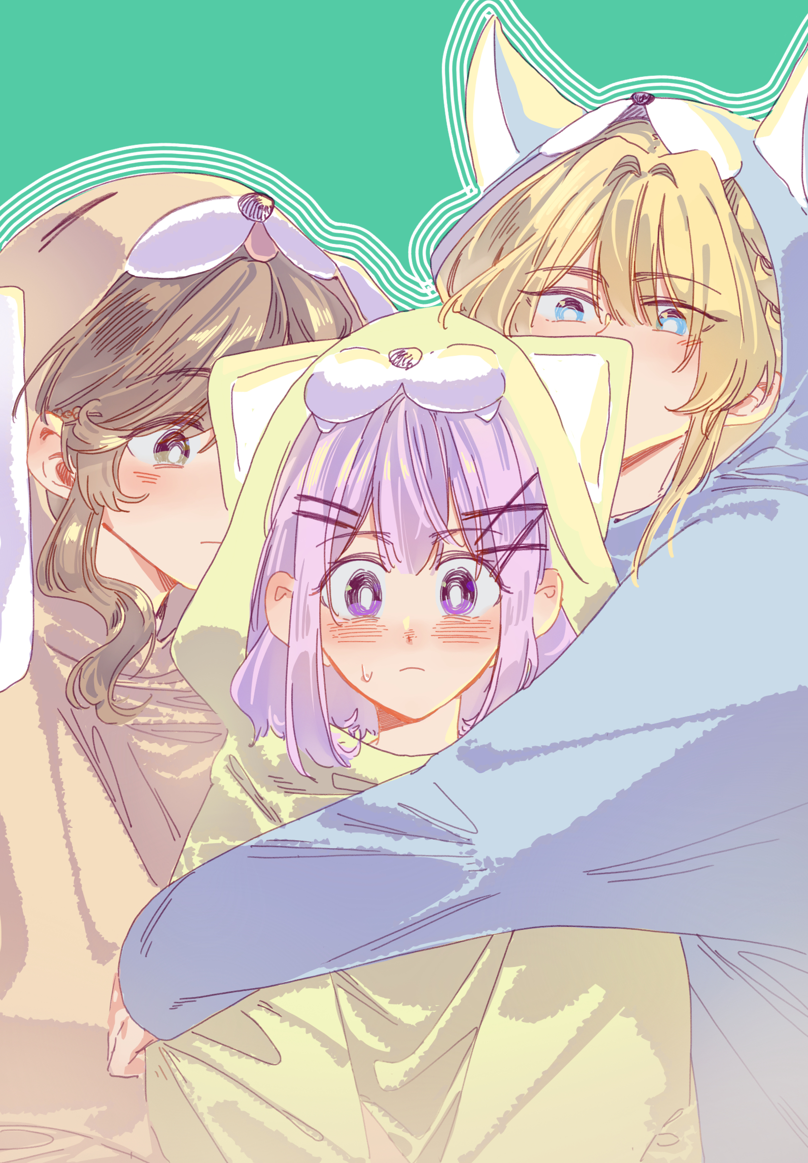 3girls amaori_renako animal_costume blonde_hair blue_eyes blush brown_eyes brown_hair closed_mouth commentary dog_costume green_background highres hug hug_from_behind long_hair medium_hair mou_liang multiple_girls onesie ouzuka_mai pink_hair purple_eyes sena_ajisai sweat watashi_ga_koibito_ni_nareru_wake_naijan_murimuri!