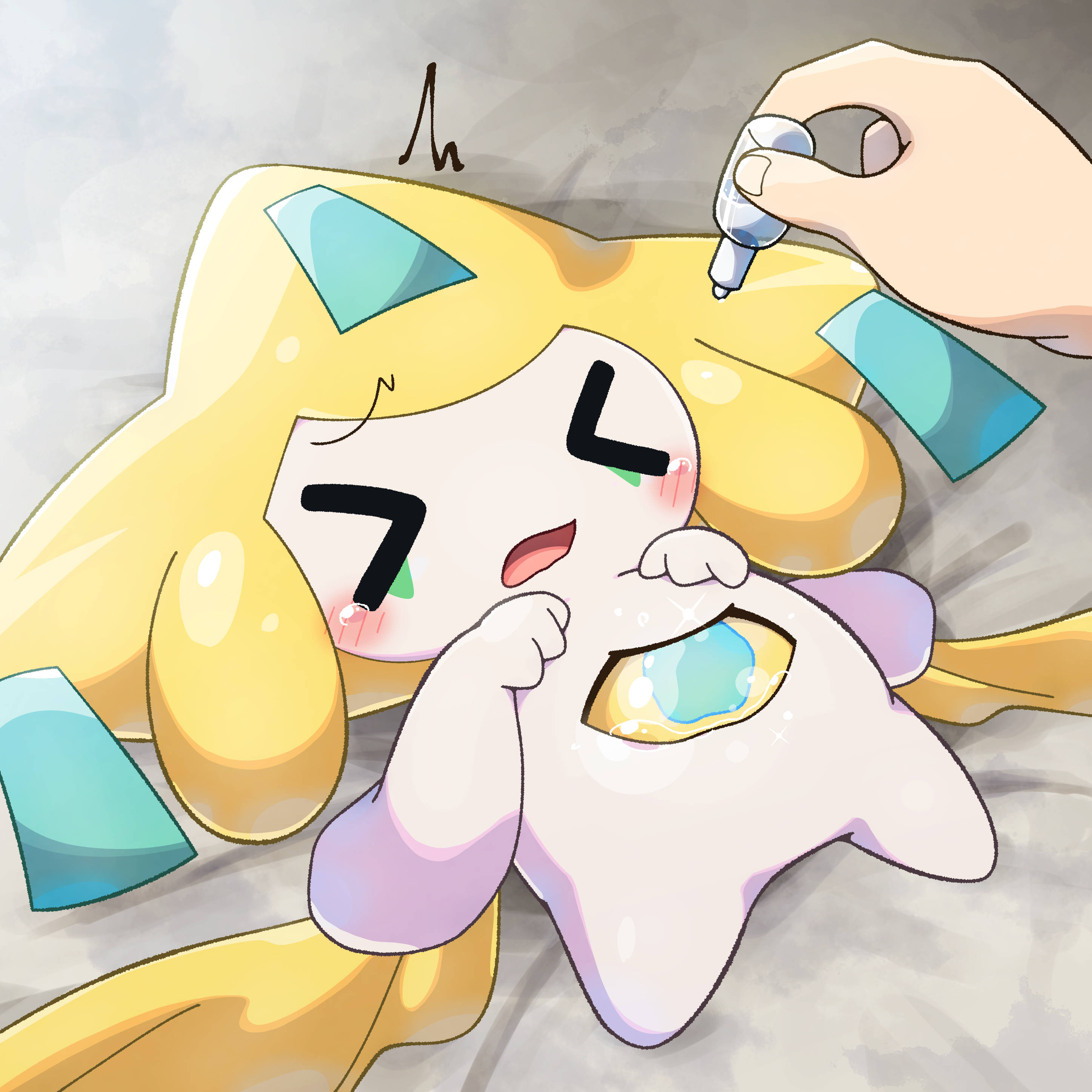 >_< 1other absurdres blush closed_eyes commentary_request eye_drops gen_3_pokemon highres holding jirachi legendary_pokemon lucky777 lying mythical_pokemon nintendo on_back open_mouth pokemon pokemon_(creature) raised_inner_eyebrows tearing_up unusually_open_eyes
