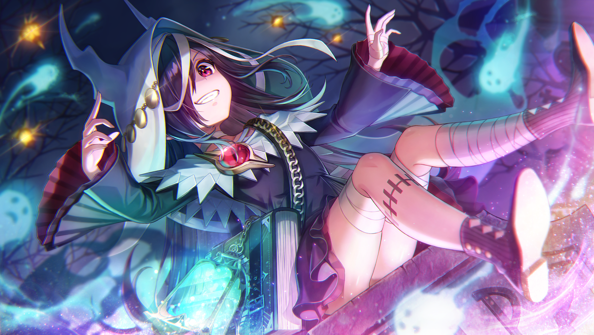 1girl :d bandaged_leg bandages bare_tree black_hair black_shoes black_socks blurry blurry_background book downturned_eyes dress dutch_angle eyelashes fang flying_sweatdrops frilled_dress frills from_below full_body gem ghost grin hair_over_one_eye hands_up heaven_burns_red highres hood hood_up knees_together_feet_apart lantern light_particles long_bangs long_hair long_sleeves looking_at_viewer looking_down night official_alternate_costume official_art one_eye_covered open_mouth outdoors red_eyes red_gem shoe_soles shoes short_dress sitting smile socks solo stitched_leg stitches tenne_miko tenne_miko_(demon_king's_necromancer_of_the_underworld) tree underlighting v-shaped_eyebrows very_long_hair white_dress white_hood wide_sleeves