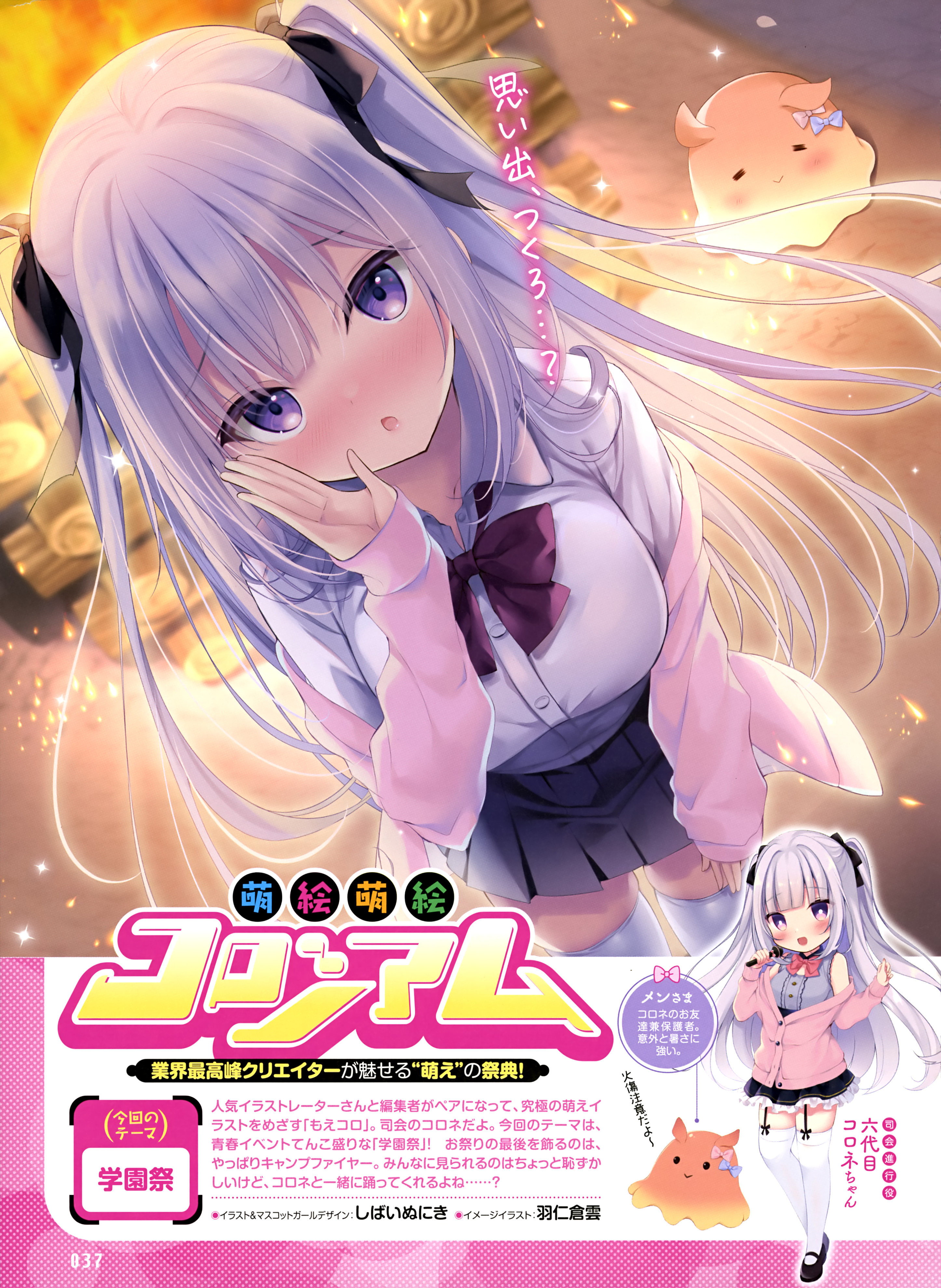 1girl :d :o absurdres artist_name black_garter_straps black_ribbon black_skirt blunt_bangs blush bow bowtie breasts cardigan cardigan_partially_removed chibi collared_shirt cover cover_page creature dengeki_moeoh feet_out_of_frame fire frilled_skirt frills from_above garter_straps grey_shirt grey_skirt hair_ribbon hand_up hands_up highres holding holding_microphone long_hair looking_at_viewer magazine_scan mary_janes medium_breasts microphone miniskirt nose_blush open_cardigan open_clothes open_mouth original outdoors page_number pink_bow pink_bowtie pink_cardigan pleated_skirt purple_eyes raised_eyebrows raised_inner_eyebrows red_bow red_bowtie ribbon scan school_uniform shibainu_niki shirt shoes sidelocks skirt sleeveless sleeveless_shirt sleeves_past_wrists smile sparkle thighhighs third-party_source translation_request two_side_up whispering white_hair white_shirt white_thighhighs zettai_ryouiki