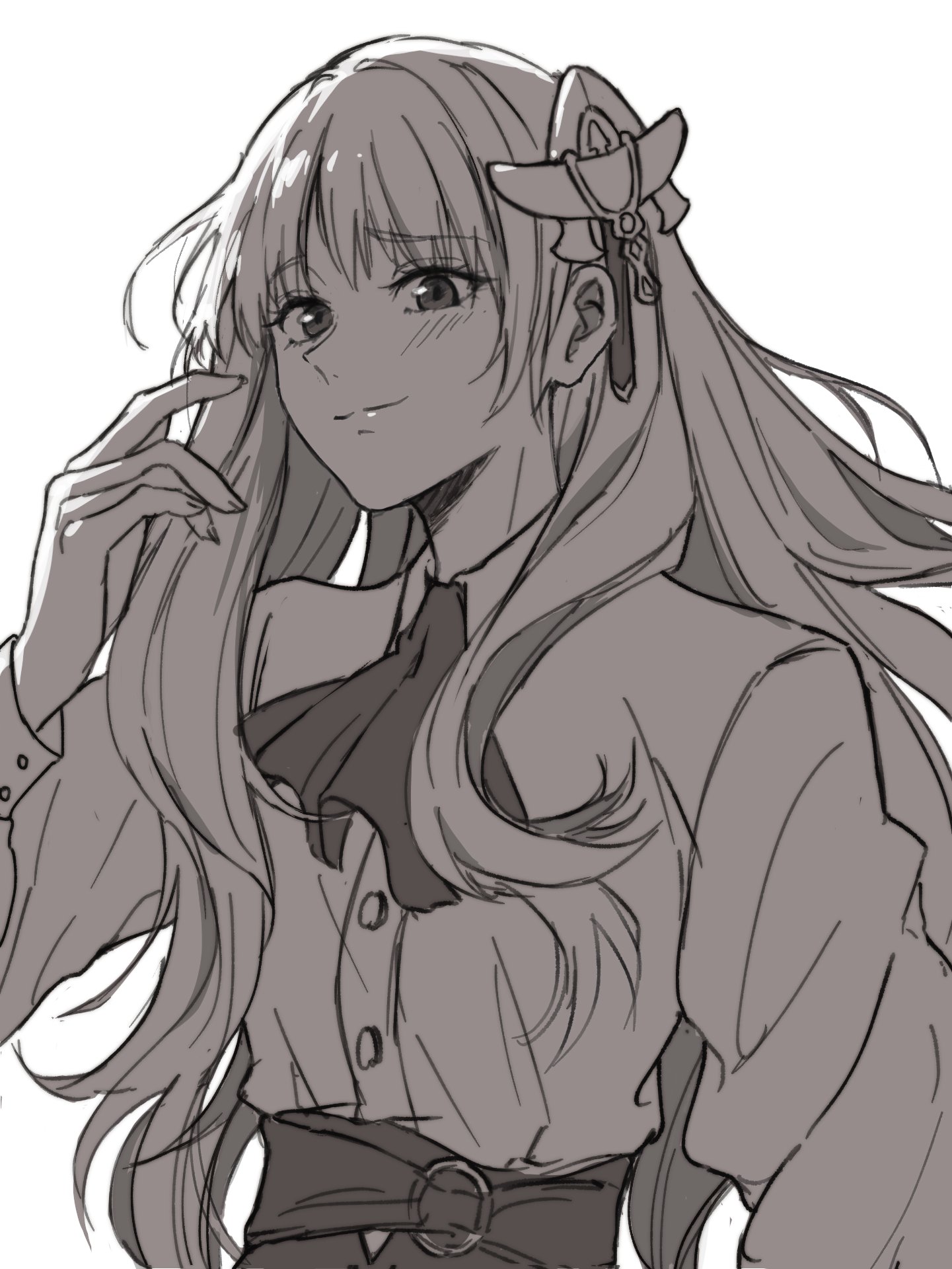 1girl ascot closed_mouth commentary_request doushittano fate/strange_fake fate_(series) fillia_(fate) greyscale highres korean_commentary long_hair monochrome smile solo white_background