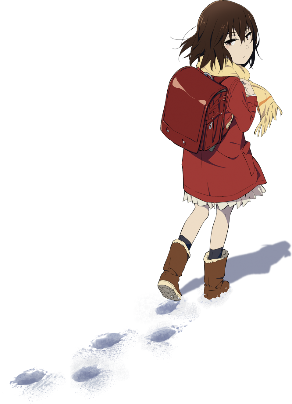 1girl anime_coloring backpack bag boku_dake_ga_inai_machi brown_eyes brown_hair child closed_mouth coat duffel_coat footprints from_behind full_body hair_between_eyes highres hinazuki_kayo holding_strap kneehighs long_sleeves looking_back official_art pleated_skirt randoseru red_coat scarf school_bag short_hair skirt socks solo standing transparent_background walking winter_clothes winter_coat yellow_scarf