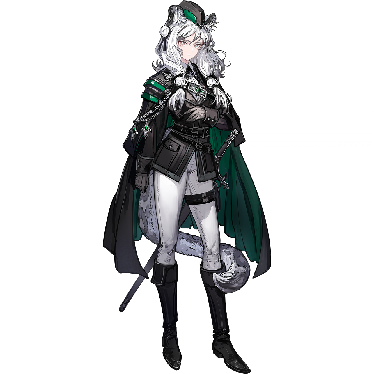 1girl arknights arm_at_side arm_under_breasts belt black_boots black_cape boots braid cape closed_mouth expressionless full_body garrison_cap green_cape grey_eyes hat highres low_twin_braids military_uniform official_art pants pants_tucked_in philippa_(arknights) ryuuzaki_ichi scabbard sheath snow_leopard_ears snow_leopard_girl snow_leopard_tail solo standing sword tachi-e thigh_belt thigh_strap third-party_source tight_clothes tight_pants transparent_background twin_braids two-tone_cape weapon white_hair