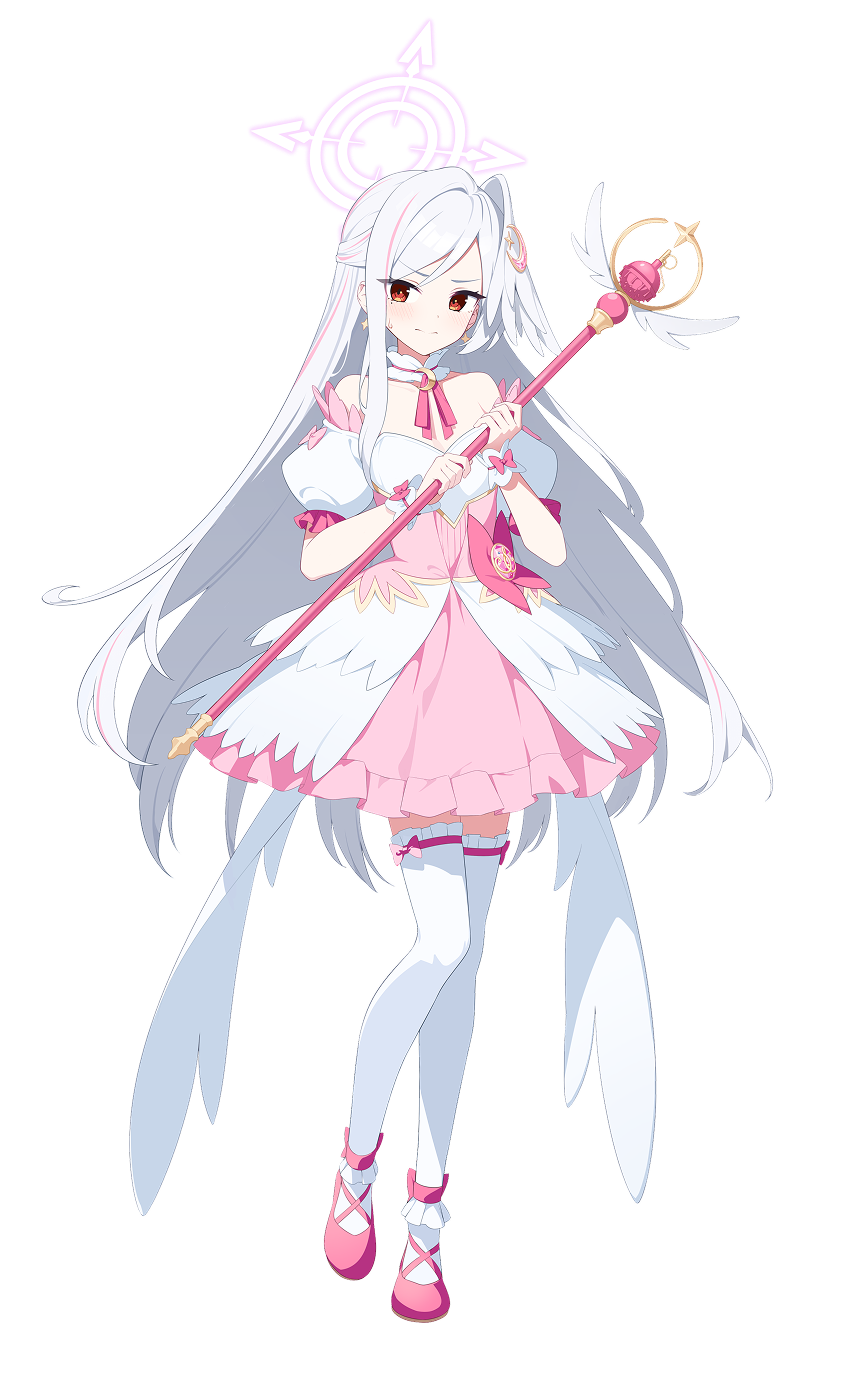 1girl artist_request bare_shoulders blue_archive border crescent crescent_hair_ornament cross-laced_shoes detached_sleeves dress frilled_dress frills full_body hair_ornament halo head_wings highres holding holding_staff long_hair looking_at_viewer mage_staff magical_girl official_alternate_costume official_art pink_dress red_eyes shoes shooting_star shy single_head_wing smile solo staff suzumi_(blue_archive) suzumi_(magical)_(blue_archive) thighhighs transparent_background white_hair white_thighhighs wings wrist_cuffs zettai_ryouiki