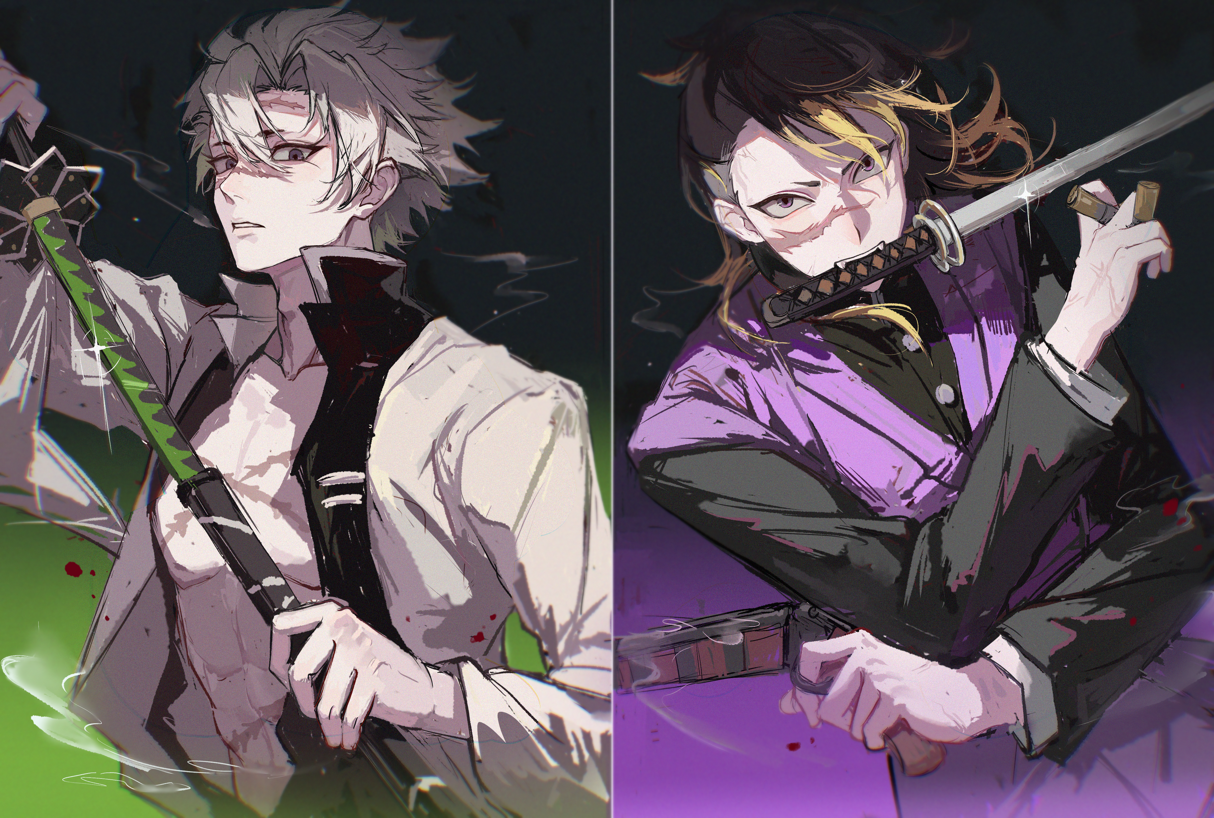 2boys absurdres ammunition black_background black_hair blonde_streaks brothers brown_eyes bullet collarbone commentary_request cowboy_shot demon_slayer_uniform gradient_background green_background grey_hair gun hair_between_eyes haori highres holding holding_bullet holding_gun holding_sheath holding_sword holding_weapon jacket japanese_clothes jing_qiu123 katana kimetsu_no_yaiba kimono long_hair long_sleeves looking_at_viewer looking_to_the_side male_focus mohawk multicolored_hair multiple_boys muscular muscular_male open_clothes open_jacket parted_lips purple_background purple_kimono scar scar_on_chest scar_on_face scar_on_forehead scar_on_nose sheath shinazugawa_genya shinazugawa_sanemi short_eyebrows short_hair shotgun_shell siblings spiked_hair split_screen streaked_hair sword sword_in_mouth two-tone_background unsheathing upper_body weapon white_jacket