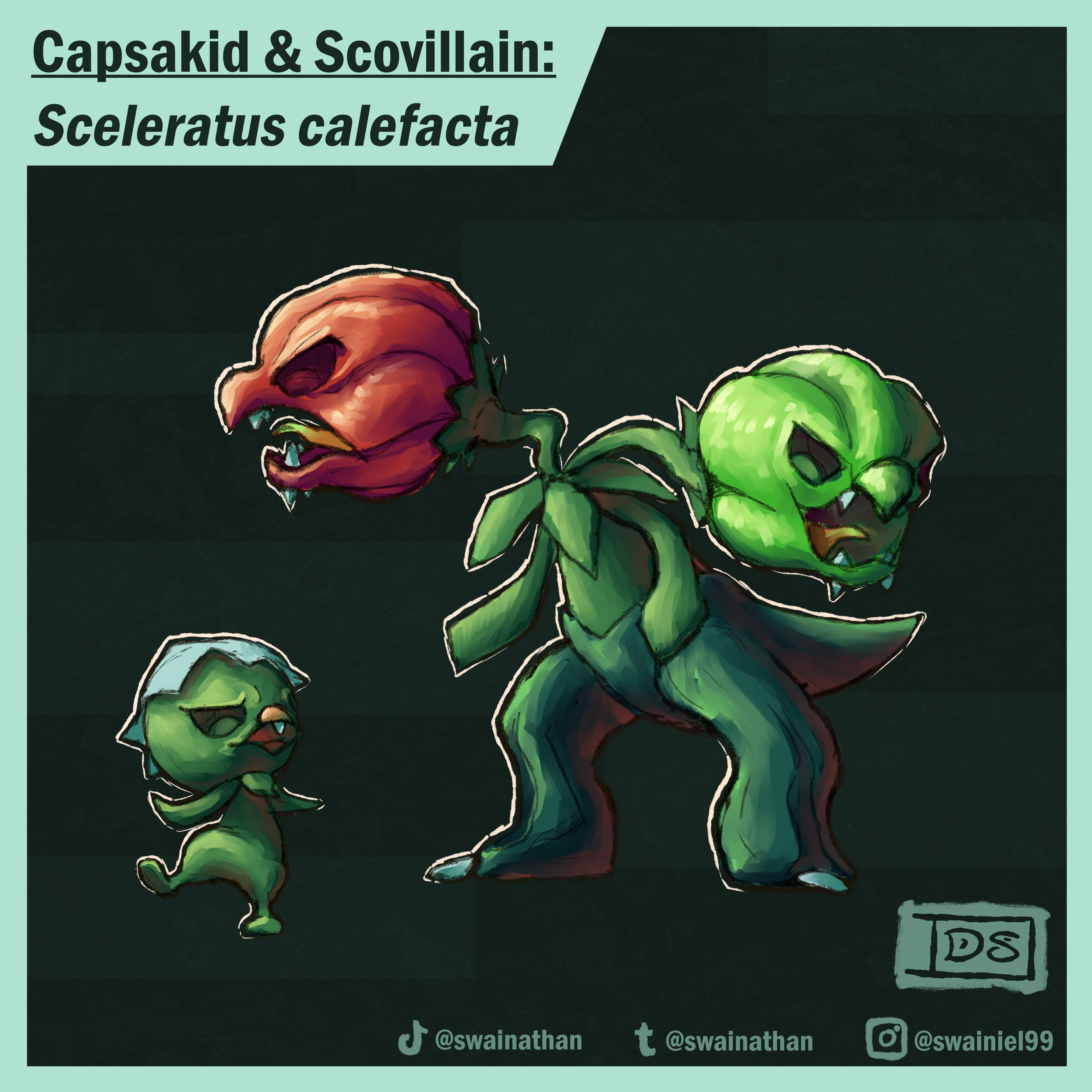 absurdres border capsakid character_name commentary english_commentary evolutionary_line fangs full_body highres instagram_logo instagram_username multiple_heads nintendo no_humans open_mouth pokemon pokemon_(creature) pokemon_focus scovillain smile standing standing_on_one_leg swainathan tiktok_logo tiktok_username tooth tumblr_logo tumblr_username