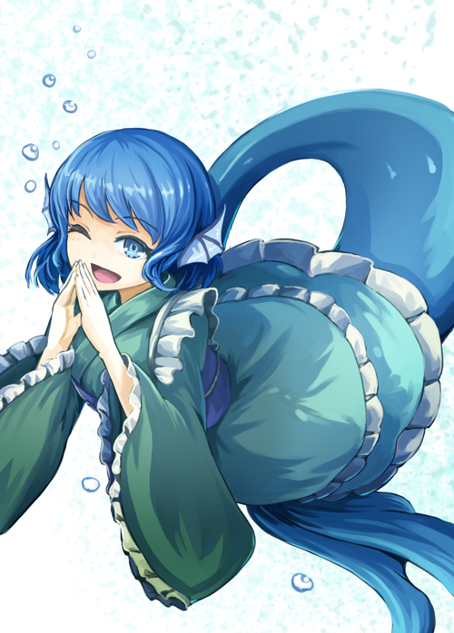 1girl air_bubble azumi_(madogiwa_bocchi_seki) blue_eyes blue_hair bubble commentary_request fins frilled_kimono frills green_kimono head_fins japanese_clothes kimono mermaid monster_girl one_eye_closed short_hair solo touhou wakasagihime