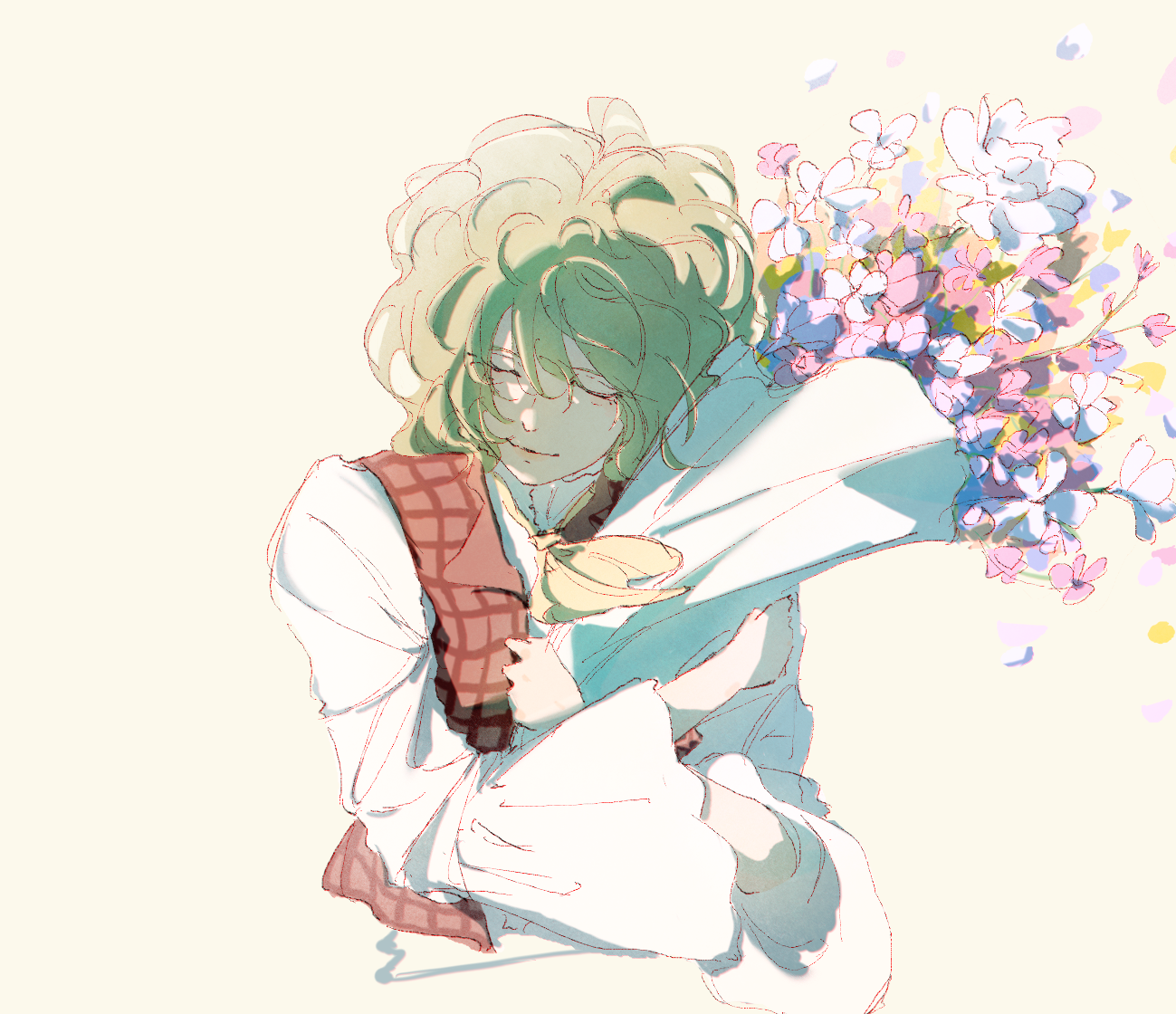 1girl ascot bouquet closed_eyes closed_mouth collared_shirt commentary_request cropped_torso falling_petals flower green_hair holding holding_bouquet hugging_object kazami_yuuka long_sleeves open_clothes open_vest petals pink_flower pink_petals plaid_clothes plaid_vest red_vest shirt short_hair smile solo touhou tukino_mei vest white_flower white_petals white_shirt yellow_ascot