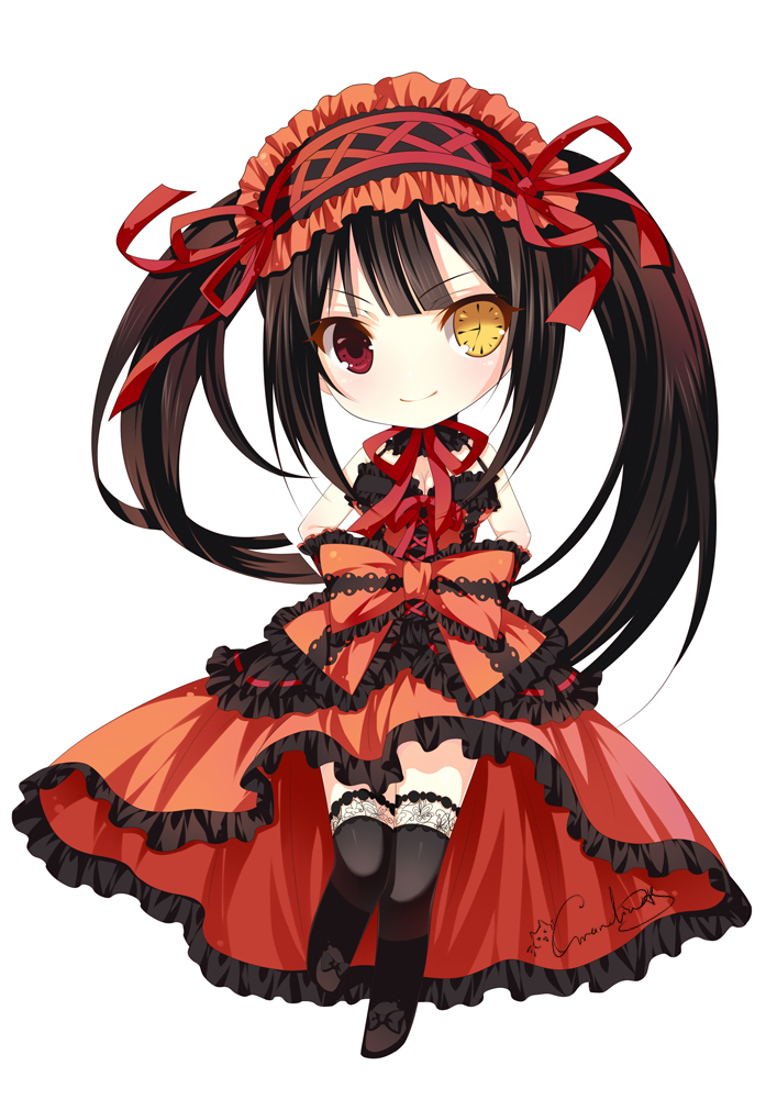 1girl black_hair chibi chibi_only clock_eyes commentary_request date_a_live dress frilled_dress frilled_hairband frills grandia_koori hairband heterochromia lolita_fashion lolita_hairband long_hair red_dress red_eyes ribbon smile solo symbol-shaped_pupils thighhighs tokisaki_kurumi tokisaki_kurumi_(spirit) twintails two-tone_dress v-shaped_eyebrows yellow_eyes