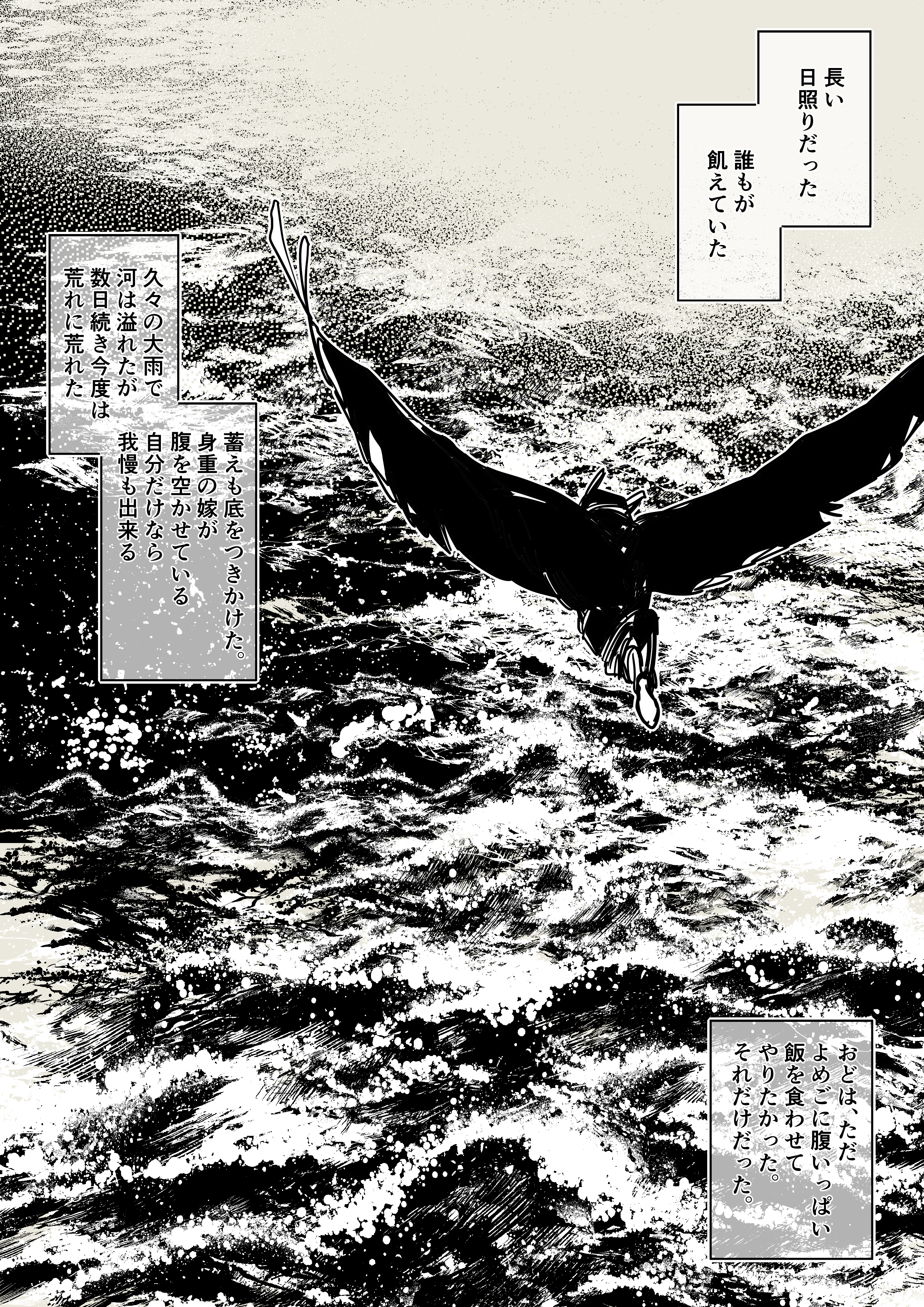 1boy absurdres bakushi_(smys2017) bird_boy bird_wings commentary_request feathered_wings flying full_body greyscale highres male_focus monochrome ocean solo translation_request tsuyaza_no_tengu water wide_shot wings
