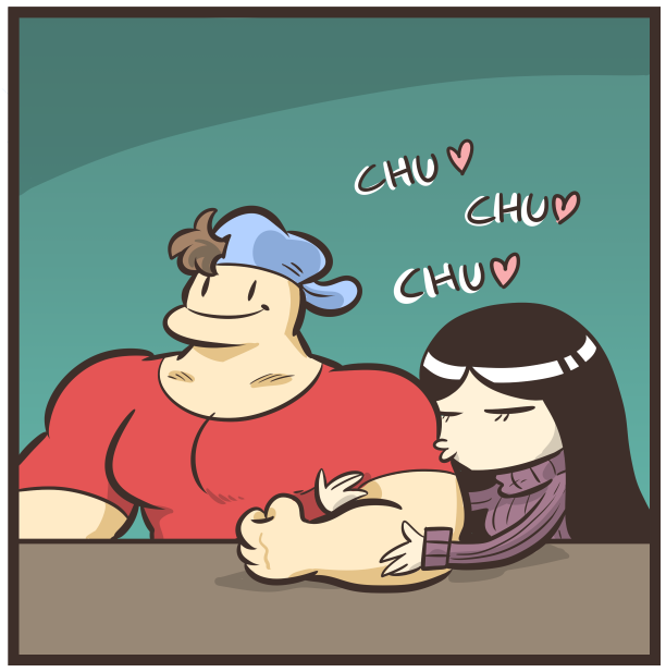 1boy 1girl black_hair green_background happy jock_(nerd_and_jock) kissing_arm olga_(nerd_and_jock) red_shirt shirt smile upper_body
