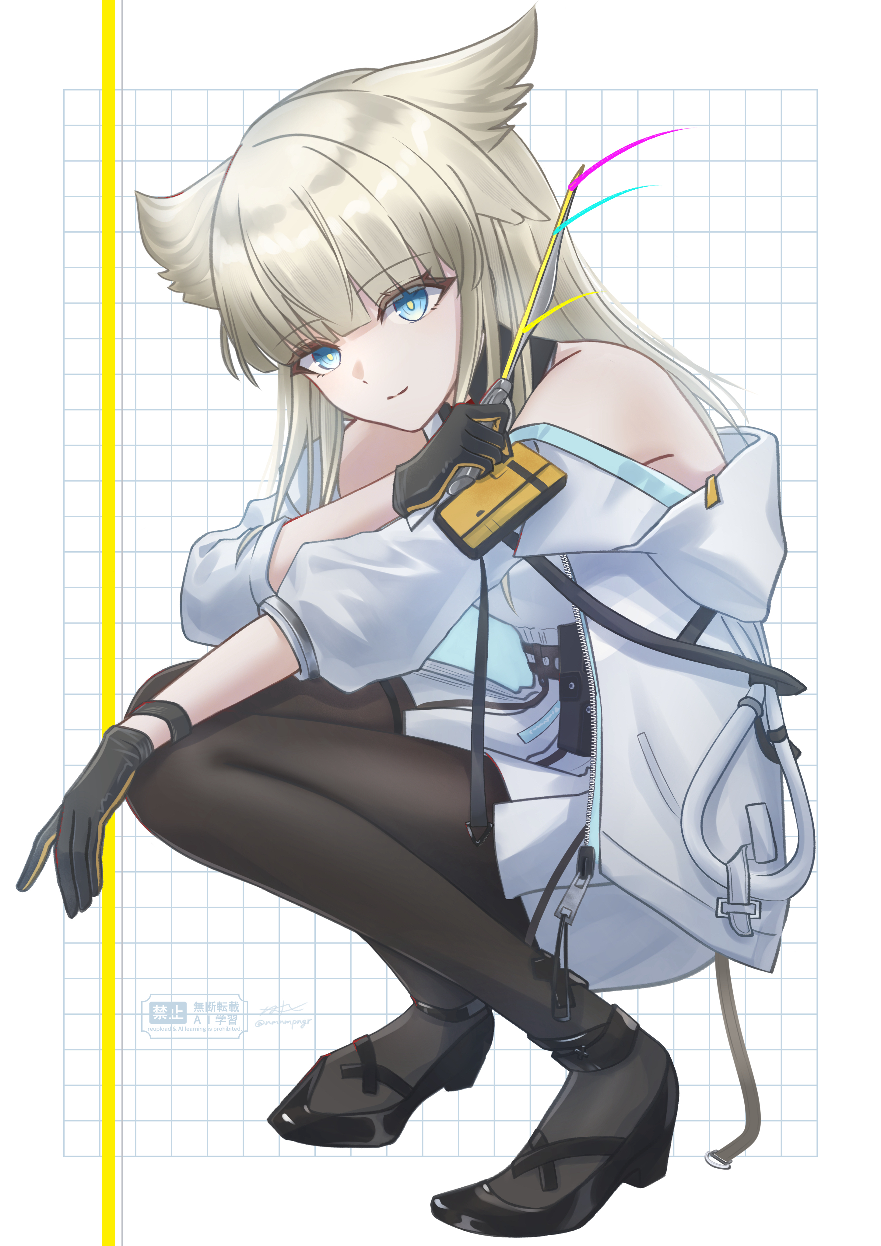1girl absurdres animal_ears arknights arknights:_endfield bare_shoulders bird_ears black_gloves black_pantyhose blue_eyes closed_mouth commentary_request dress gloves grey_hair highres holding holding_wand jacket long_hair looking_at_viewer nmnmpngr open_clothes open_jacket pantyhose perlica_(arknights) solo squatting wand white_dress white_jacket