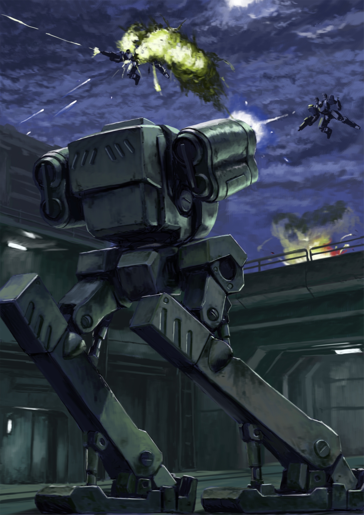armored_core bishop_(armored_core) cloud commentary_request dark_cloud explosion firing flying highres mecha muscle_tracer_(armored_core) no_humans reverse-jointed_legs robot science_fiction tyokugekidato