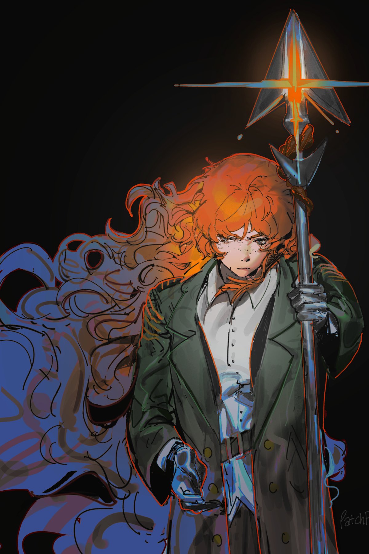 1girl belt black_background black_coat buttons closed_mouth coat collared_shirt commentary_request freckles hair_between_eyes hand_up harpoon highres holding holding_harpoon ishmael_(project_moon) korean_commentary lapels light_frown limbus_company long_hair long_sleeves looking_to_the_side notched_lapels open_clothes open_coat orange_hair pants patchfire pequod_(identity)_(project_moon) project_moon serious shirt sideburns solo very_long_hair white_shirt
