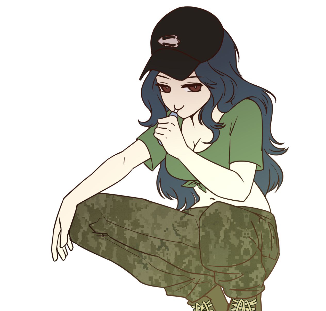 1girl anichiva bad_link blue_hair boots brown_eyes camouflage camouflage_pants cropped_shirt digital_camouflage electronic_cigarette green_boots green_pants green_shirt hat highres holding kraken_(japanon) kraken_regiment long_hair looking_at_viewer narrowed_eyes original pants shirt short_sleeves simple_background smile smug solo squatting stomach t-shirt tied_shirt white_background