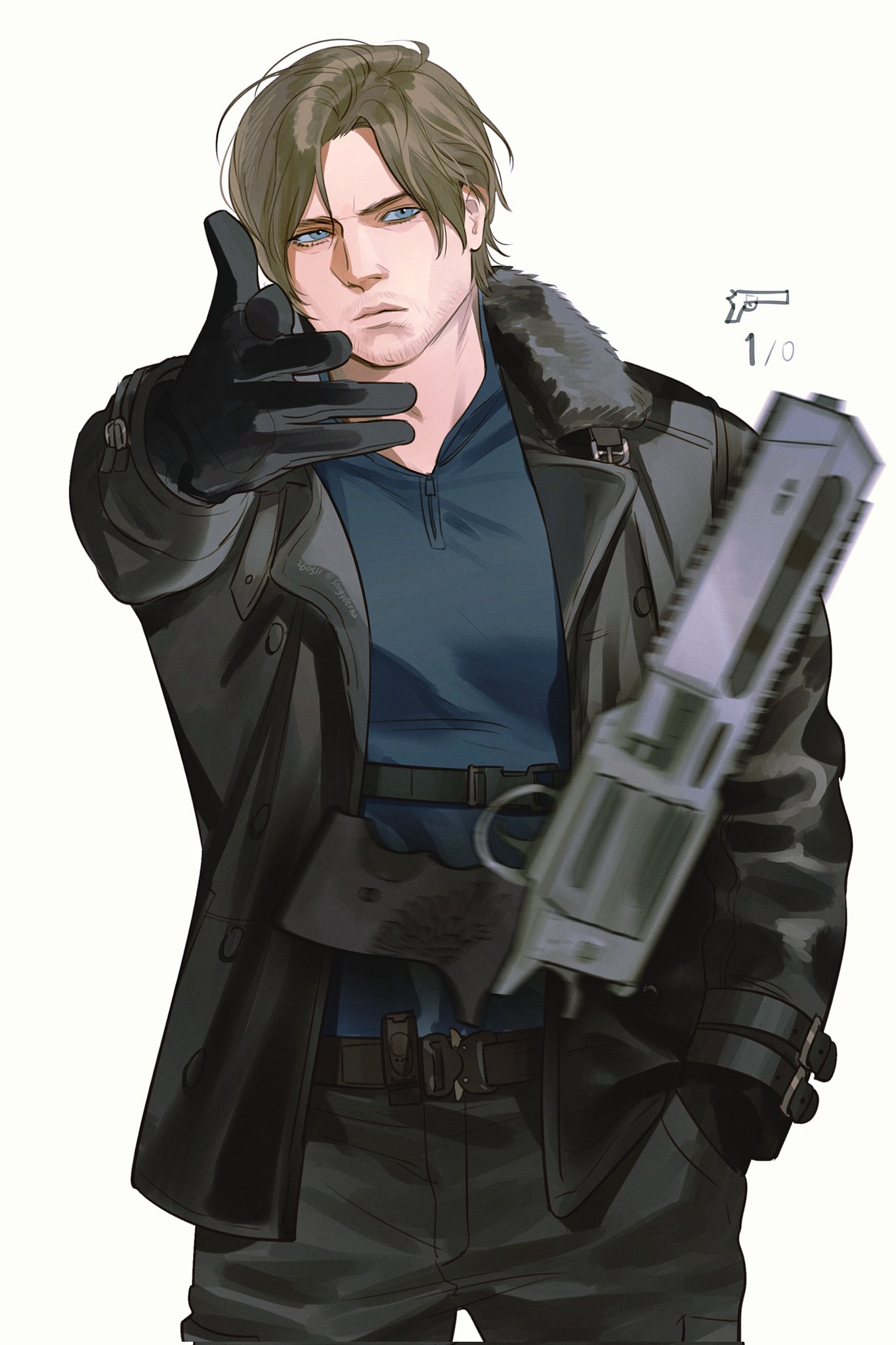 1boy arm_up belt belt_buckle black_belt black_gloves black_jacket black_pants blue_eyes blue_shirt brown_hair buckle closed_mouth commentary_request frown gloves gun hand_in_pocket handgun highres jacket korean_commentary lapels leon_s._kennedy long_sleeves low_bore_axis_revolver male_focus meme notched_lapels open_clothes open_jacket pants parted_hair requiem_(resident_evil) resident_evil resident_evil_requiem revolver rifle-caliber_handgun rifle-caliber_revolver rsh-12 shirt simple_background solo songyeerhu weapon white_background woe_plague_be_upon_ye_(meme) wrist_belt