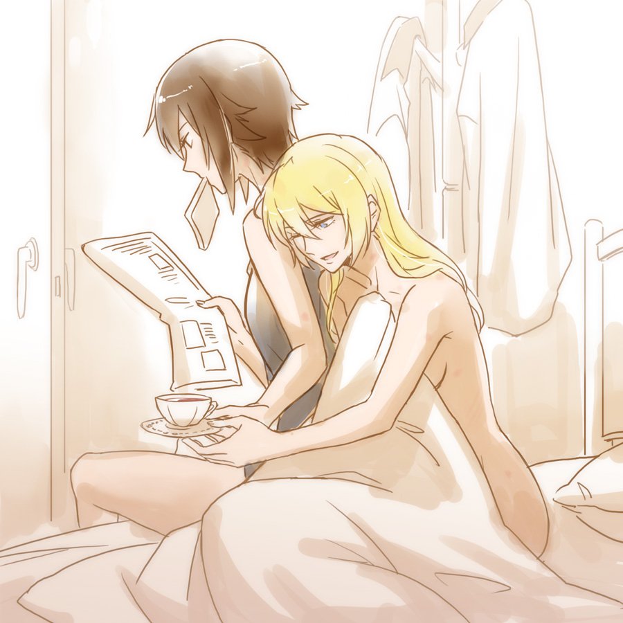 2girls ;d blue_eyes bread bread_slice breasts brown_eyes brown_hair commentary_request covered_erect_nipples cup darjeeling_(girls_und_panzer) food food_in_mouth girls_und_panzer holding holding_cup holding_newspaper indoors large_breasts long_hair multiple_girls newspaper nishizumi_maho nude on_bed one_eye_closed open_mouth partially_colored reading short_hair sitting smile teacup yohchi yuri