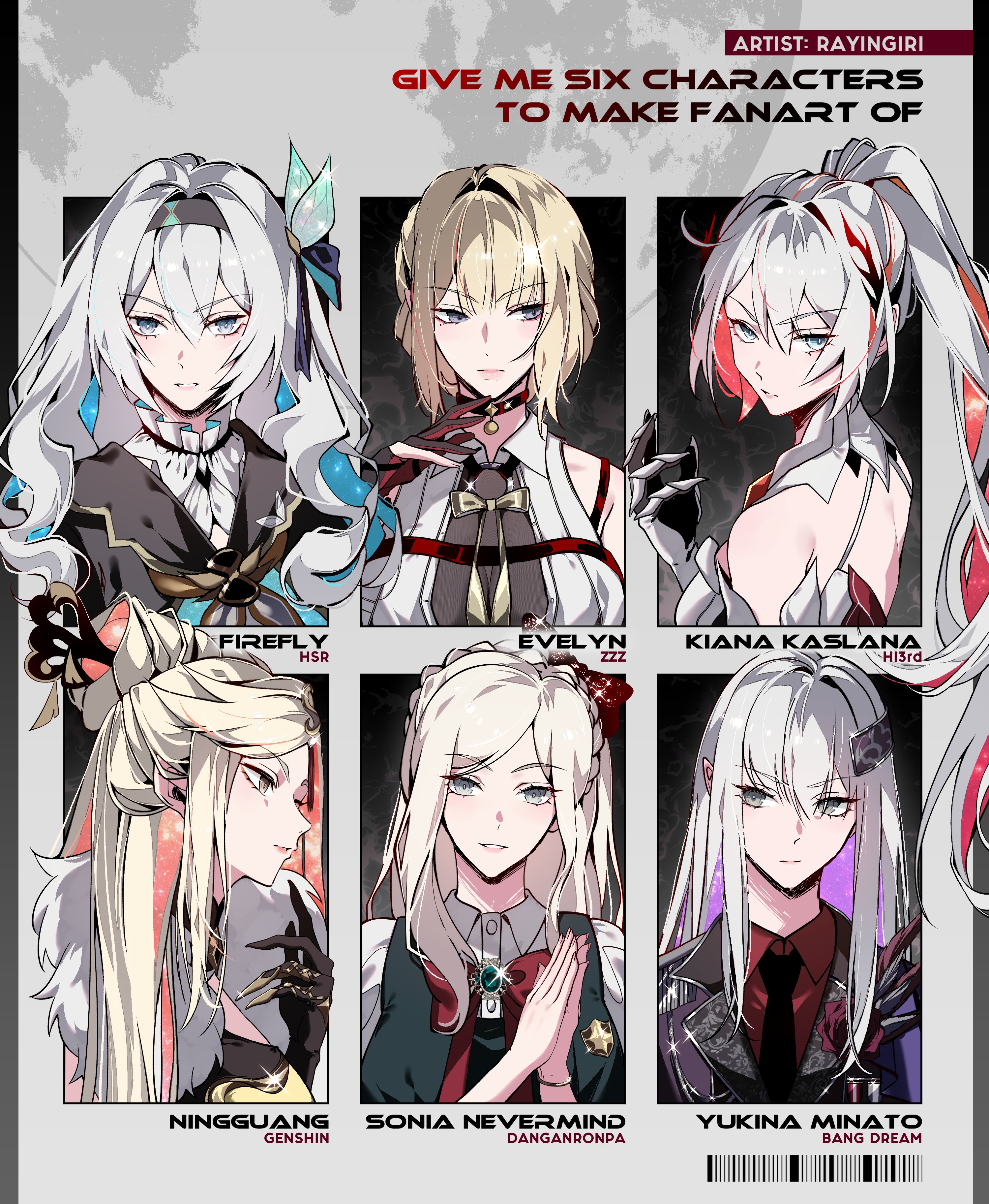6+girls absurdres ahoge bang_dream! black_capelet black_gloves black_hairband black_necktie blonde_hair blue_eyes bow bowtie breasts capelet danganronpa_(series) danganronpa_2:_goodbye_despair evelyn_chevalier firefly_(honkai:_star_rail) genshin_impact gloves hairband hashtag-only_commentary highres honkai:_star_rail honkai_(series) honkai_impact_3rd kiana_kaslana kiana_kaslana_(herrscher_of_flamescion) large_breasts long_hair mihoyo minato_yukina multicolored_hair multiple_drawing_challenge multiple_girls necktie ningguang_(genshin_impact) purple_eyes rayingiri red_bow red_bowtie red_hair shirt short_hair six_fanarts_challenge sonia_nevermind streaked_hair two-tone_hair very_long_hair white_hair white_shirt zenless_zone_zero