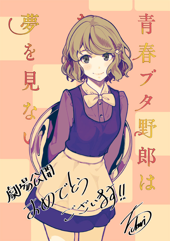 1girl apron brown_hair commentary_request hair_ornament hidari_(left_side) koga_tomoe long_sleeves looking_at_viewer seishun_buta_yarou shirt skirt smile solo waitress white_apron