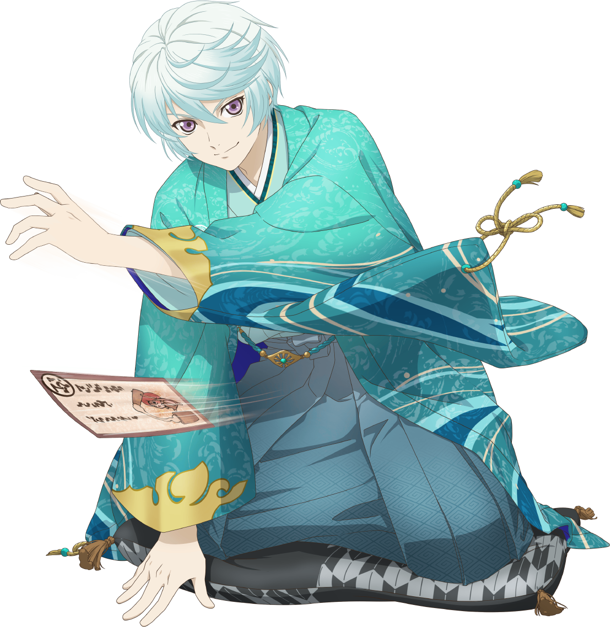 1boy aqua_haori aqua_kimono artist_request blue_hair blue_sandals card closed_mouth full_body game_cg gradient_hair haori highres japanese_clothes kimono looking_at_viewer male_focus mikleo_(kimono)_(tales) mikleo_(tales) multicolored_hair official_alternate_costume official_art on_cushion print_haori purple_eyes sandals short_hair sitting smile socks solo tales_of_(series) tales_of_asteria tales_of_zestiria third-party_source transparent_background two-tone_hair white_hair white_socks