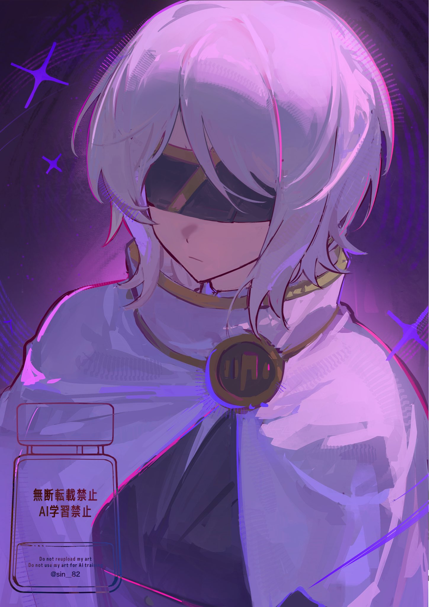 1girl blindfold cape closed_mouth faust_(project_moon) highres index_(identity)_(project_moon) limbus_company long_sleeves portrait project_moon purple_background shirt short_hair simple_background sin_82 solo star_(symbol) watermark white_cape white_hair