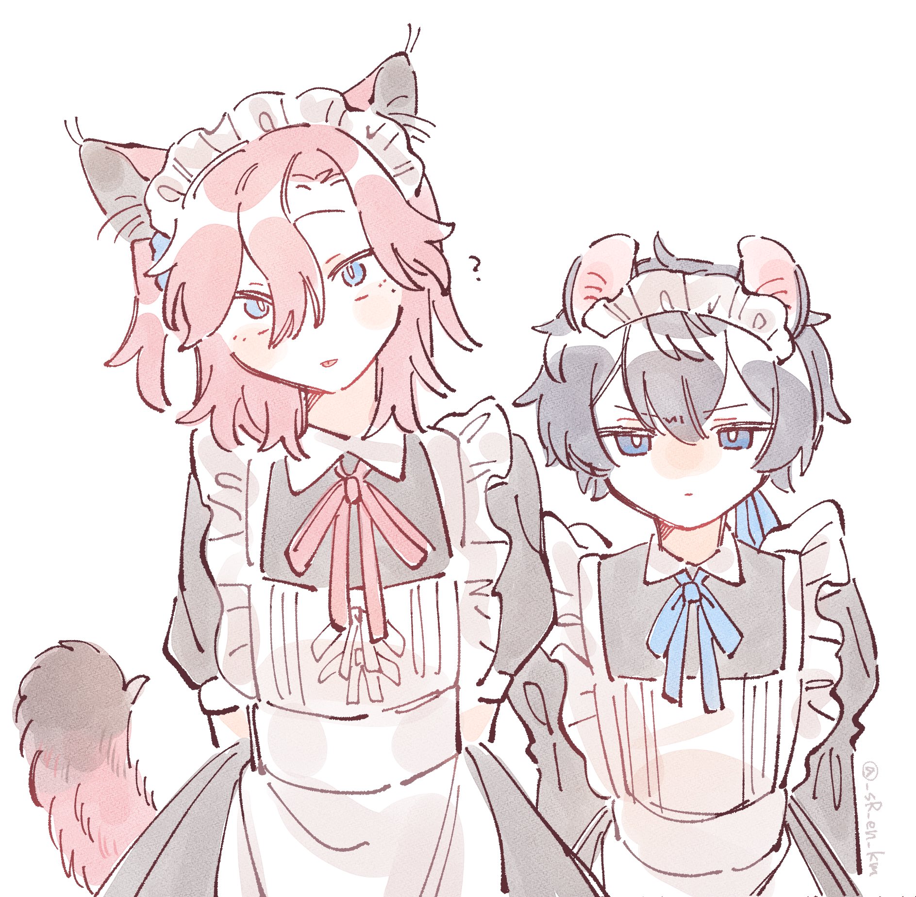 2boys :p ? angry apron arms_at_sides arms_behind_back black_dress black_hair bright_pupils cat_boy commentary_request crossdressing crossdressing_(mtf) dress gradient_tail head_tilt highres hyoutenka_30-do_no_zetsubou juliet_sleeves kemonomimi_mode kuchinashi_dabi long_sleeves looking_at_viewer maid male_maid medium_hair mouse_boy multiple_boys neck_ribbon one_side_up pastel_colors puffy_short_sleeves puffy_sleeves red_hair ribbon short_hair short_sleeves simple_background sr_en_km tongue tongue_out tonimura_yui v-shaped_eyebrows white_apron white_background