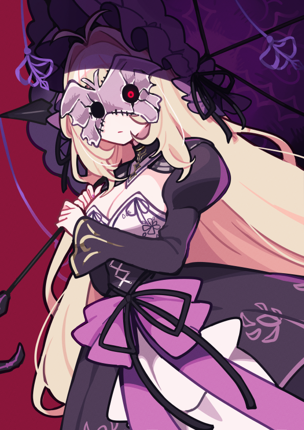 1girl black_dress black_ribbon blonde_hair bonnet bow breasts cleavage cleavage_cutout closed_mouth clothing_cutout dress dulcinea_(project_moon) eyelashes hair_intakes holding holding_umbrella large_breasts limbus_company long_hair mask project_moon purple_bonnet purple_bow red_background red_eyes ribbon solo standing sukiahiru umbrella very_long_hair
