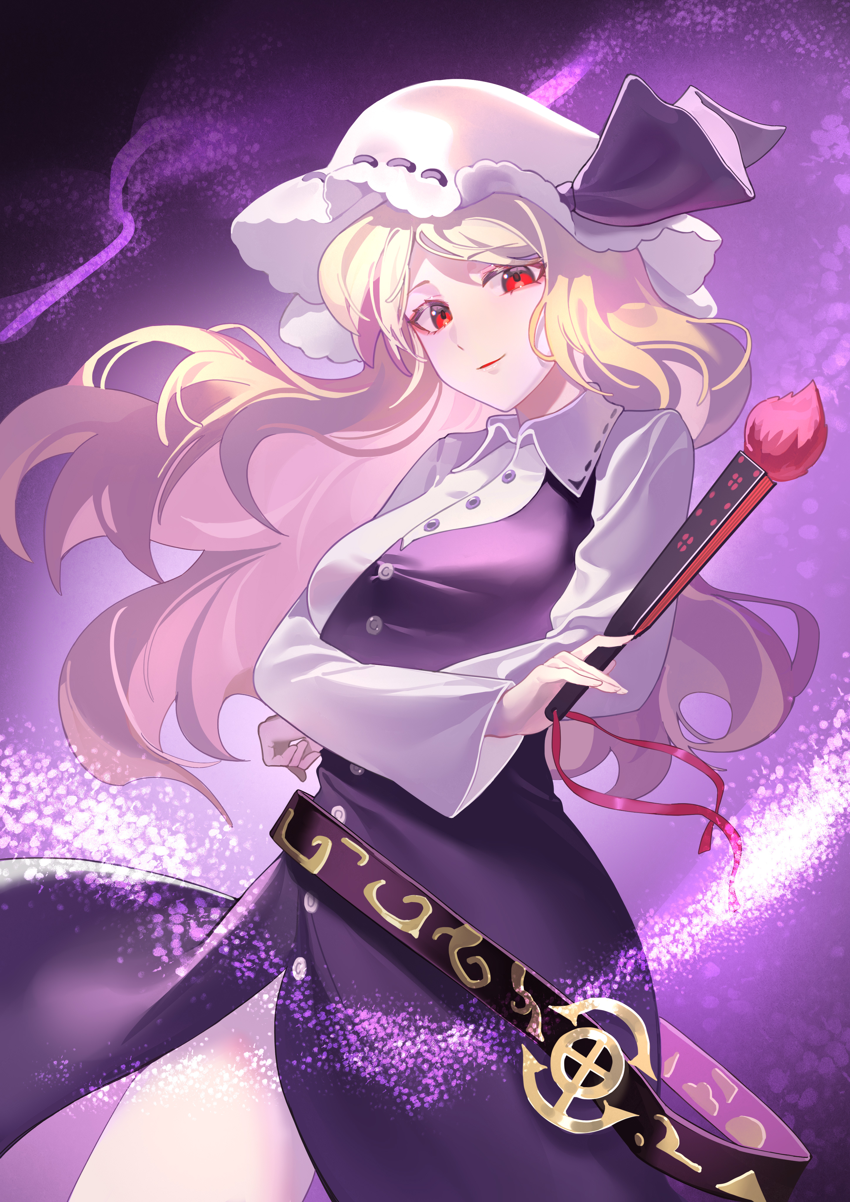 1girl absurdres ailu_elf blonde_hair buttons commentary_request dress fossilized_wonders hand_fan hat highres holding holding_fan long_sleeves looking_at_viewer parted_lips puffy_long_sleeves puffy_sleeves purple_background purple_dress red_eyes shirt smile solo touhou watatsuki_no_toyohime white_hat white_shirt