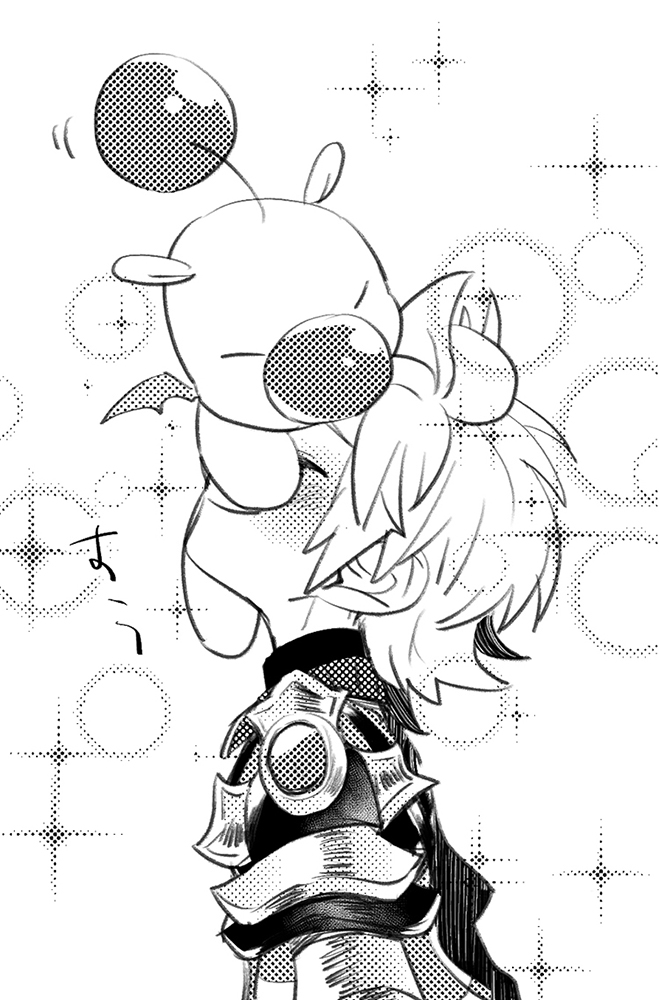 1boy armor bat_wings blush closed_eyes commentary_request creature creature_on_head greyscale happy_aura kingdom_hearts kingdom_hearts_birth_by_sleep kouki_(ko_ki_9) looking_up male_focus mini_wings monochrome moogle screentones short_hair shoulder_armor smile sparkle spiked_hair upper_body ventus_(kingdom_hearts) wings