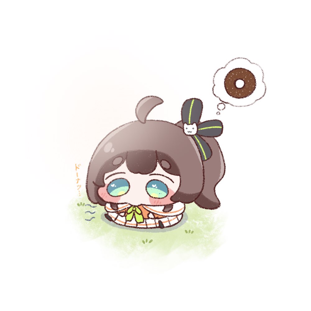 1girl ahoge black_ribbon blue_eyes blush_stickers brown_hair chibi chibi_only commentary_request donut food full_body grass hair_ribbon hololive maronsd_(maron_04242525) natsuiro_matsuri on_ground orange_shirt pleated_skirt ribbon shirt short_hair side_ponytail simple_background sitting skirt solo speech_bubble spoken_food striped_ribbon thick_eyebrows thought_bubble virtual_youtuber white_background white_skirt yurie_mouth