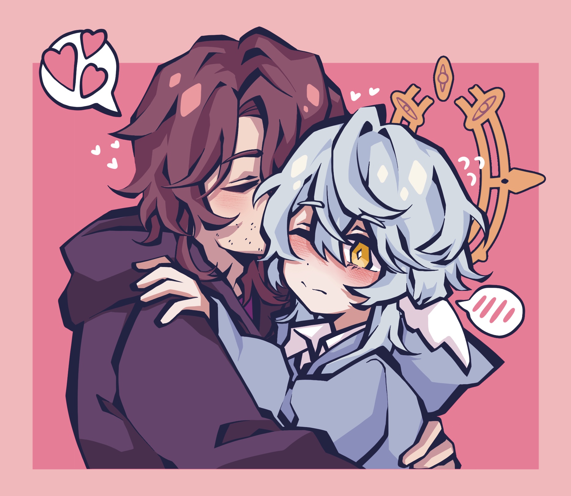 2boys ahoge black_hoodie blue_hair blue_hoodie blush border bright_pupils brim_hatter brown_hair closed_eyes closed_mouth commentary couple covered_mouth cropped_shoulders curtained_hair diamond-shaped_pupils diamond_(shape) dot_nose double-parted_bangs facial_hair flying_sweatdrops gallagher_(honkai:_star_rail) hair_between_eyes halo halo_behind_head hand_on_another's_back hand_on_another's_shoulder head_wings heart highres honkai:_star_rail honkai_(series) hood hood_down hoodie hug kiss kissing_hair male_focus medium_hair multiple_boys one_eye_closed pink_background pink_border simple_background spiked_halo split_mouth spoken_blush spoken_heart stubble sunday_(honkai:_star_rail) symbol-shaped_pupils u_u white_pupils white_wings wing_collar wings yaoi yellow_eyes