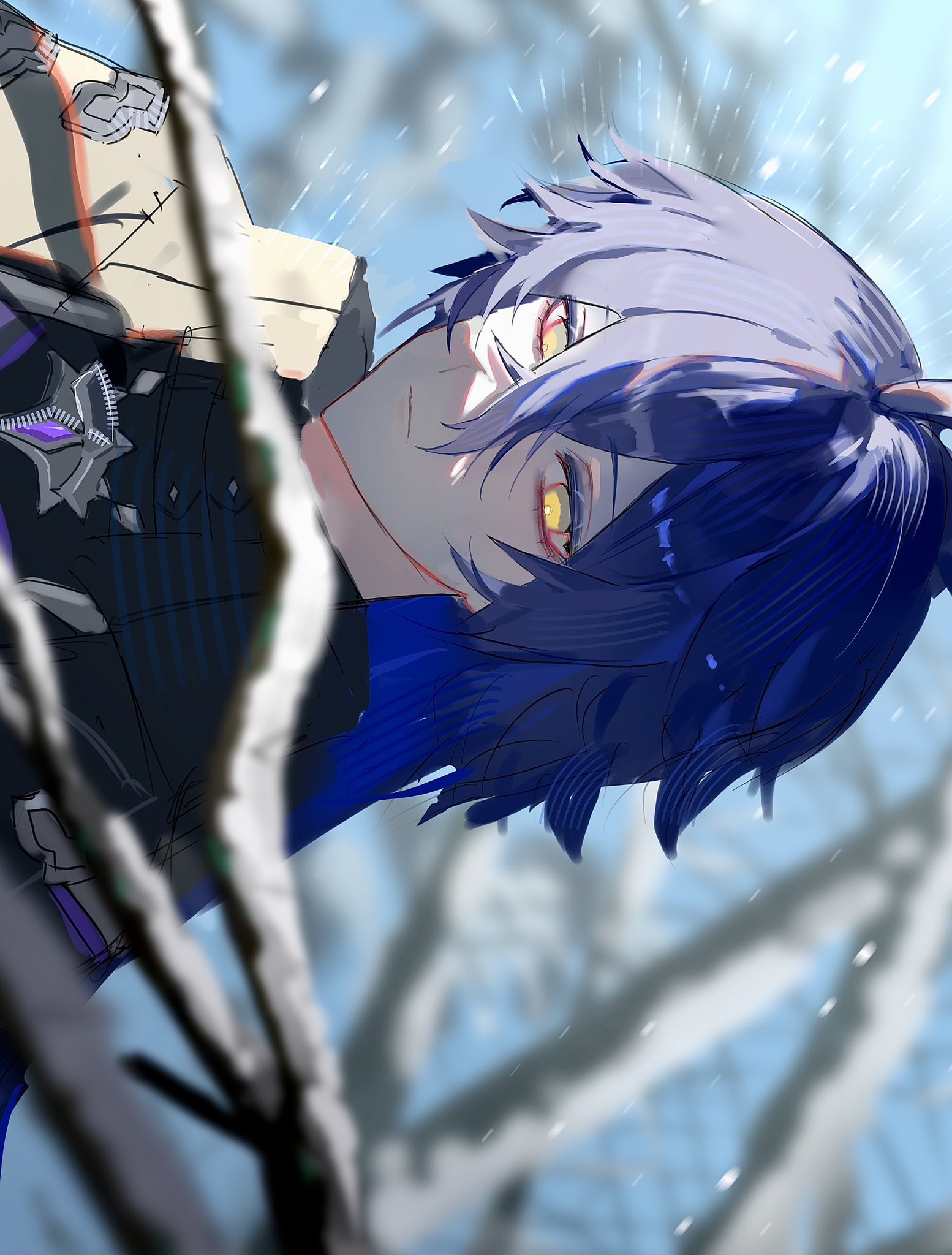 1boy bare_tree black_capelet blue_hair blue_sky branch capelet closed_mouth crossed_bangs double-parted_bangs flins_(genshin_impact) genshin_impact hashtag-only_commentary highres irzm30 long_hair male_focus outdoors sideways sky solo tree very_long_hair yellow_eyes