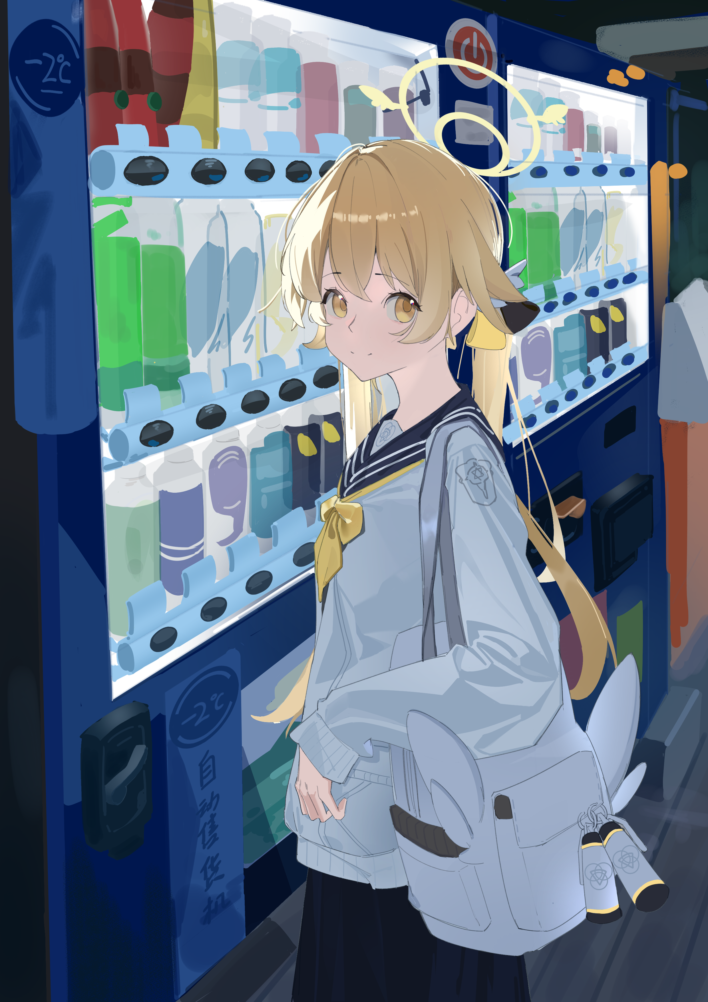 1girl absurdres blonde_hair blue_archive chinese_commentary commentary_request daishu_yuzishi explosive grenade halo hifumi_(blue_archive) highres long_hair looking_at_viewer night sailor smile stun_grenade twintails vending_machine yellow_eyes yellow_halo