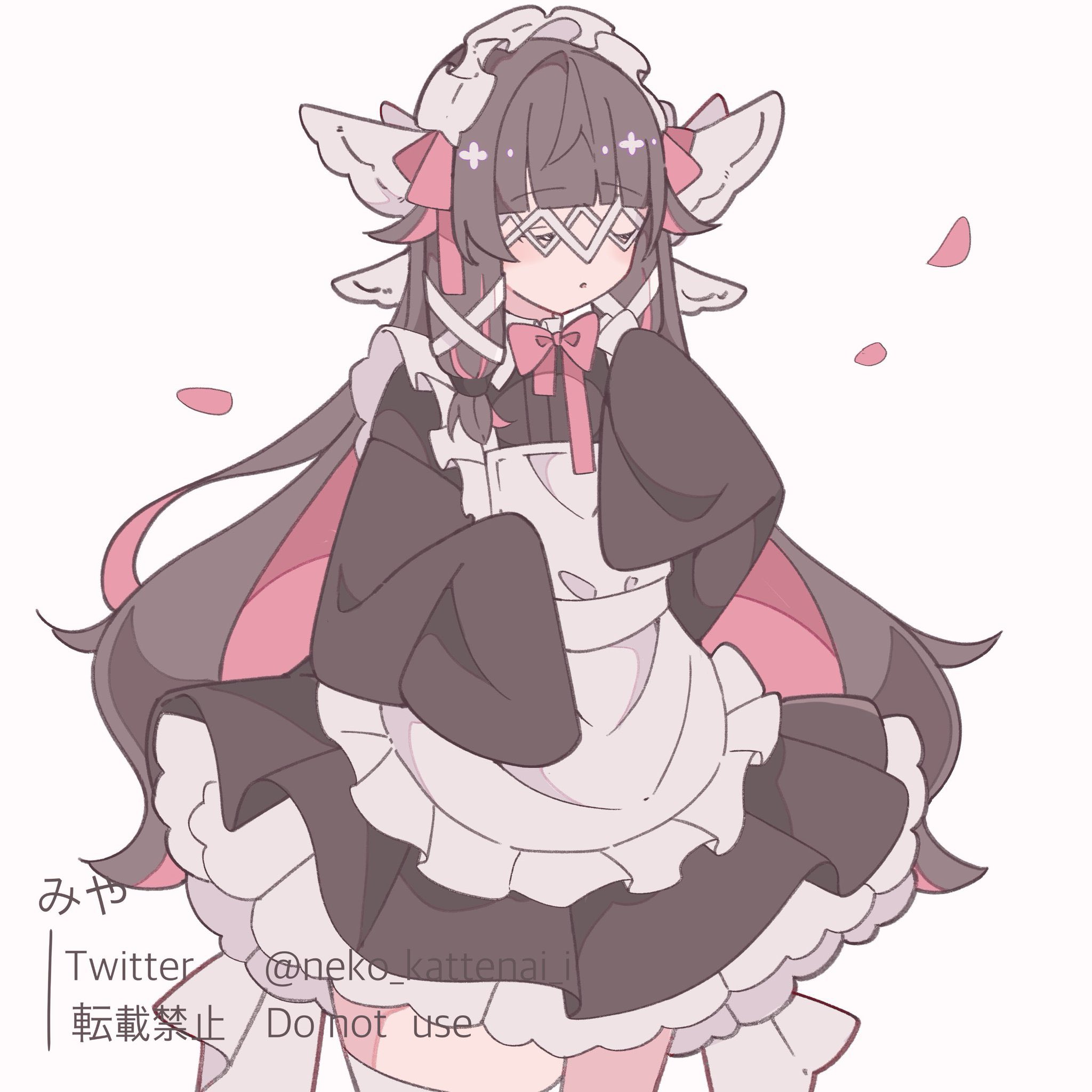 1girl alternate_costume apron black_dress black_hair blunt_bangs bow bowtie closed_eyes colored_inner_hair columbina_(genshin_impact) commentary_request cowboy_shot dress eye_mask frilled_apron frills genshin_impact hair_ribbon head_wings highres long_hair maid maid_apron maid_headdress mask multicolored_hair neko_kattenai_i pink_bow pink_bowtie pink_hair ribbon simple_background sleeves_past_fingers sleeves_past_wrists solo twitter_username watermark white_apron white_background wings