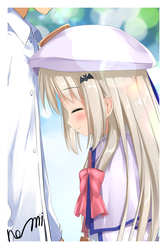 1boy 1girl blonde_hair blurry blush bokeh cloak closed_eyes commentary depth_of_field hat height_difference kudpoid_(71139) little_busters! long_hair noumi_kudryavka profile shirt smile white_shirt