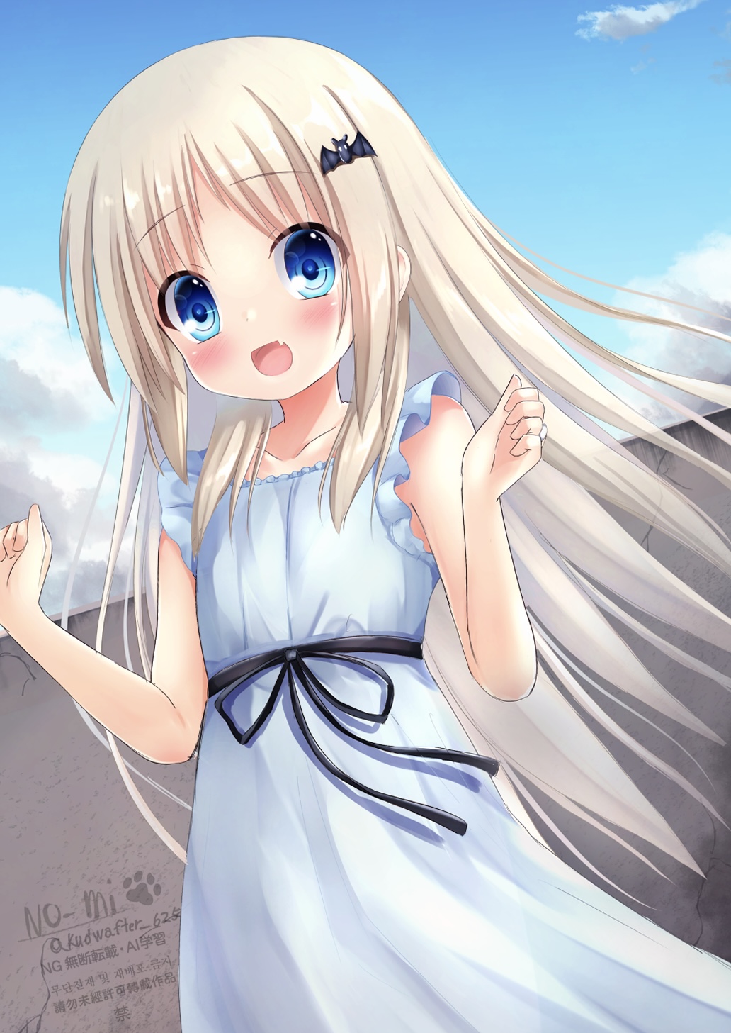 1girl blonde_hair blue_dress blue_eyes blue_sky blush commentary_request dress fang flat_chest highres kudpoid_(71139) little_busters! long_hair looking_at_viewer noumi_kudryavka open_mouth outdoors sky smile solo wind