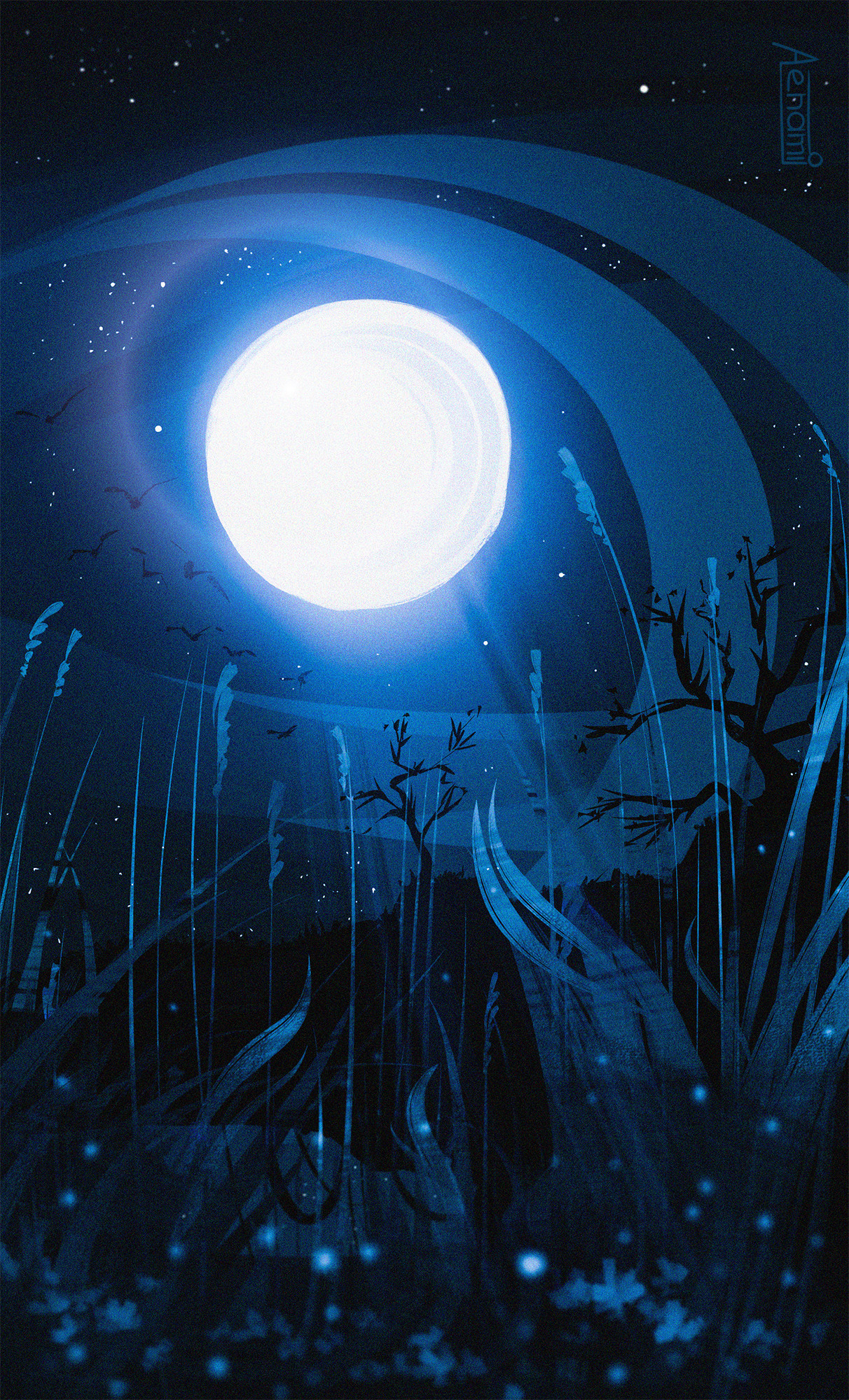 aenamiart artist_name blue_theme commentary english_commentary full_moon grass highres landscape light_particles moon moonlight night no_humans original painterly scenery sky star_(sky) starry_sky tree