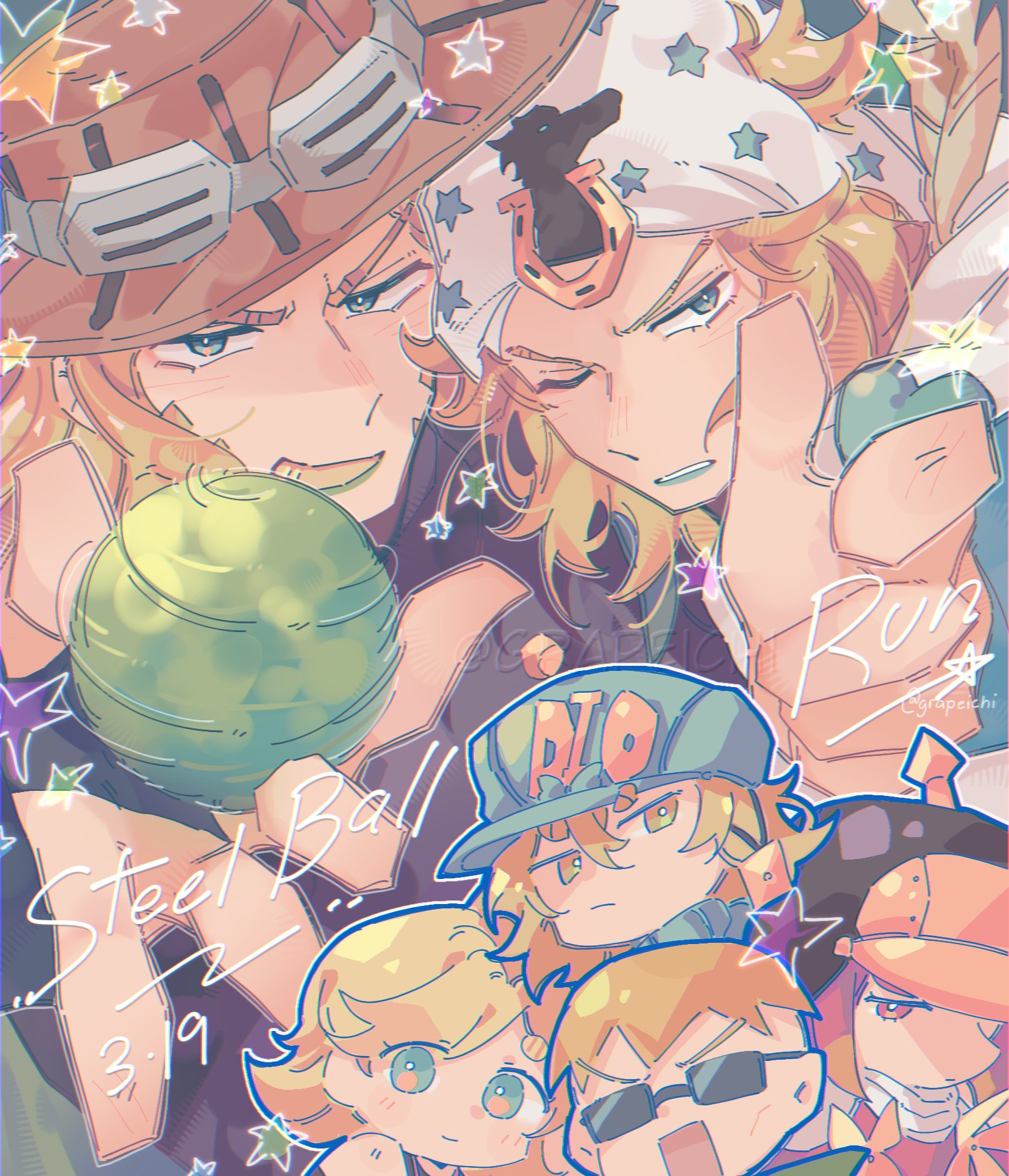 2girls 4boys aqua_eyes aqua_hat black_hat blonde_hair blue_lips brown_hat chibi chibi_inset commentary copyright_name diego_brando finger_gun goggles goggles_on_headwear grapeichi green_lips grin gyro_zeppeli hat highres hot_pants_(sbr) johnny_joestar jojo_no_kimyou_na_bouken long_hair looking_at_viewer lucy_steel male_focus medium_hair multiple_boys multiple_girls one_eye_closed pink_eyes pink_hair rectangular_mouth short_hair smile steel_ball_(jojo) steel_ball_run steven_steel twitter_username yellow_eyes