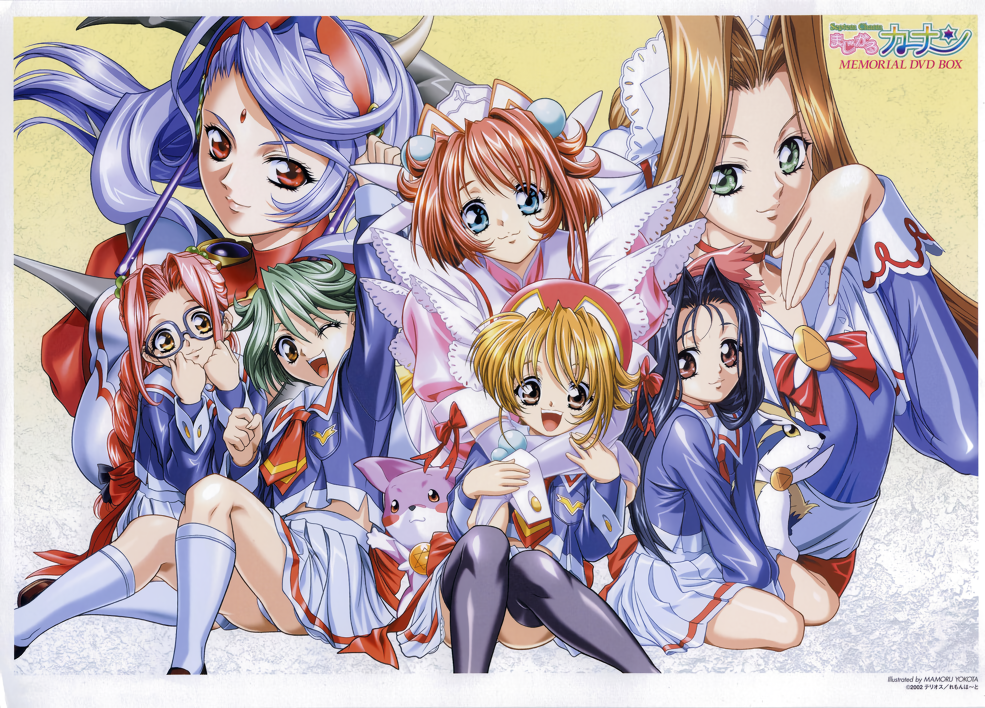 6+girls arm_up artist_name ascot black_hair black_thighhighs blue_eyes blue_hair brown_eyes brown_hair forehead_jewel green_eyes green_hair hat headdress hiiragi_chihaya hug hug_from_behind long_hair long_sleeves looking_at_viewer magical_canan medium_hair midriff_peek mizuki_sayaka multiple_girls natsuki_(magical_canan) non-web_source official_art one_eye_closed open_mouth panties pantyshot photoshop_(medium) pink_hair pleated_skirt rectangular_eyewear red_eyes red_hair school_uniform sitting skirt smile swept_bangs teeth thighhighs underwear upper_teeth_only v_arms white_skirt yellow_eyes yokota_mamoru yokozuwari
