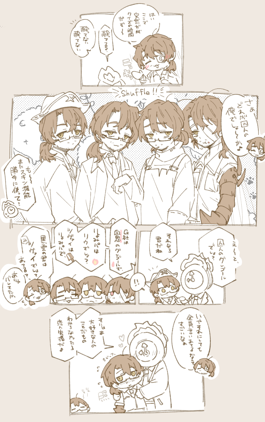 1other 6+boys :3 :t absurdres ahoge alcohol alternate_costume amputee animal_print antennae apron arm_around_shoulder arthropod_boy arthropod_limbs bandage_on_face bandage_over_one_eye bandaged_arm bandaged_head bandages beard_stubble belt black-framed_eyewear black-framed_glasses blush bottle breast_pocket brown_hair buckle cigarette cleaver clock closed_eyes coat coat_on_shoulders cockroach_boy collared_jacket collared_shirt comic contrast_collar dante_(limbus_company) dress_shirt eating elbow_gloves expressionless extra_wings eyepatch facial_hair fire flying_sweatdrops food food_on_face formal_clothes four_wings from_side g_corp._(identity)_(project_moon) glasses gloves gregor_(project_moon) greyscale hair_between_eyes hair_intakes half-closed_eyes hand_in_pocket hand_up hat head_only heart highres holding holding_bottle holding_hands hook hook_hand hug hug_from_side insect_wings jacket jitome joints knife kurokumo_clan_(identity)_(project_moon) lapels lily26983455 limbus_company long_hair long_sleeves looking_at_another looking_at_viewer looking_to_the_side low_ponytail male_focus mechanical_arms monochrome monster_boy mouth_hold multiple_boys multiple_wings musical_note necktie notched_lapels object_head official_alternate_costume one-eyed one_eye_covered open_clothes open_coat open_mouth open_vest pants parted_bangs partially_unbuttoned paw_print pirate_costume pirate_hat pocket ponytail pouch project_moon prosthesis prosthetic_arm r.b._(identity)_(project_moon) sake sake_bottle sanpaku semi-rimless_eyewear shirt sideways_glance single_mechanical_arm sleeves_rolled_up smile smoke smoking speech_bubble spoken_object stubble suit sweatdrop sweater torn_apron torn_clothes turtleneck turtleneck_shirt turtleneck_sweater twinhook_pirates_(identity)_(project_moon) under-rim_eyewear upper_body vest wavy_hair wings zwei_association_south_uniform