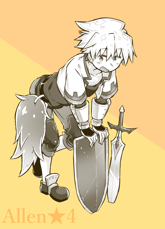 1boy ahonobo allen_llewellyn character_name commentary_request full_body male_focus monochrome open_mouth orange_background road_to_dragons shield solo sword two-tone_background weapon yellow_background