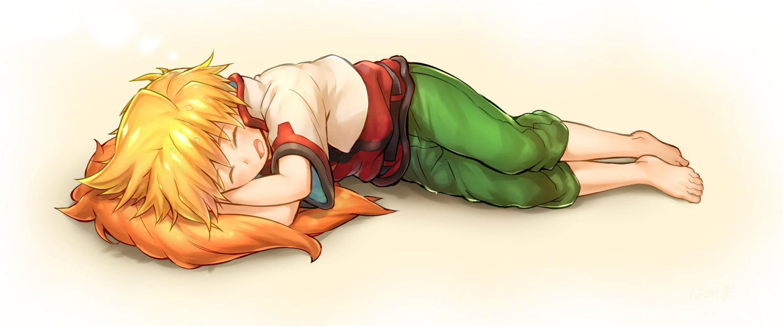 1boy ahonobo allen_llewellyn barefoot blonde_hair blush capri_pants closed_eyes commentary_request drooling full_body green_pants highres lying male_focus on_side open_mouth orange_hair pants road_to_dragons sleeping solo