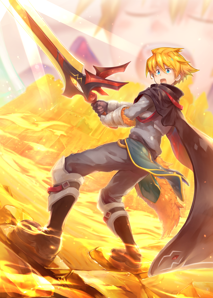 1boy ahonobo allen_llewellyn armor blonde_hair blue_eyes boots cape closed_eyes commentary_request gloves highres holding holding_sword holding_weapon male_focus open_mouth road_to_dragons solo sword tail weapon